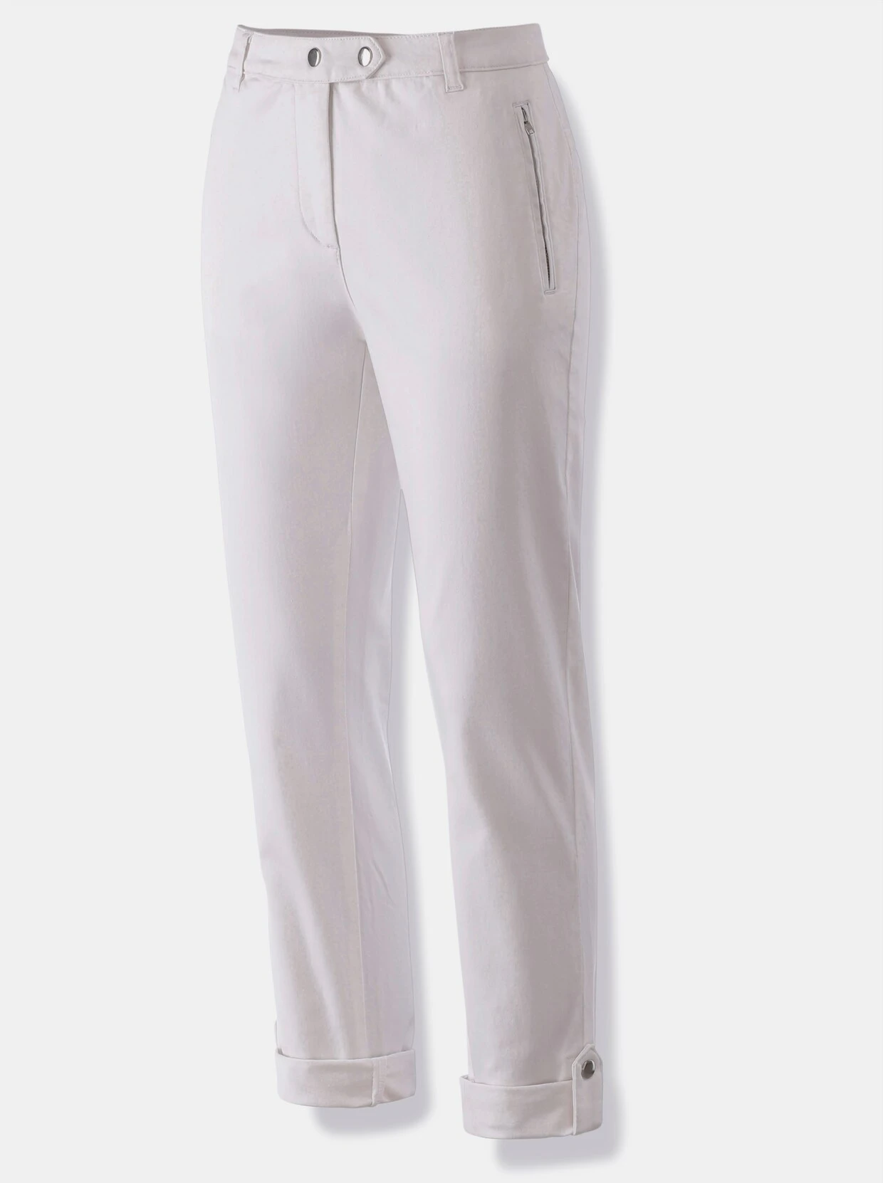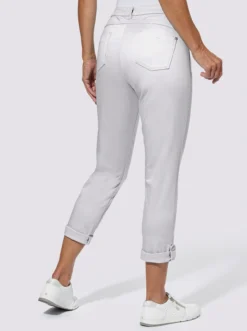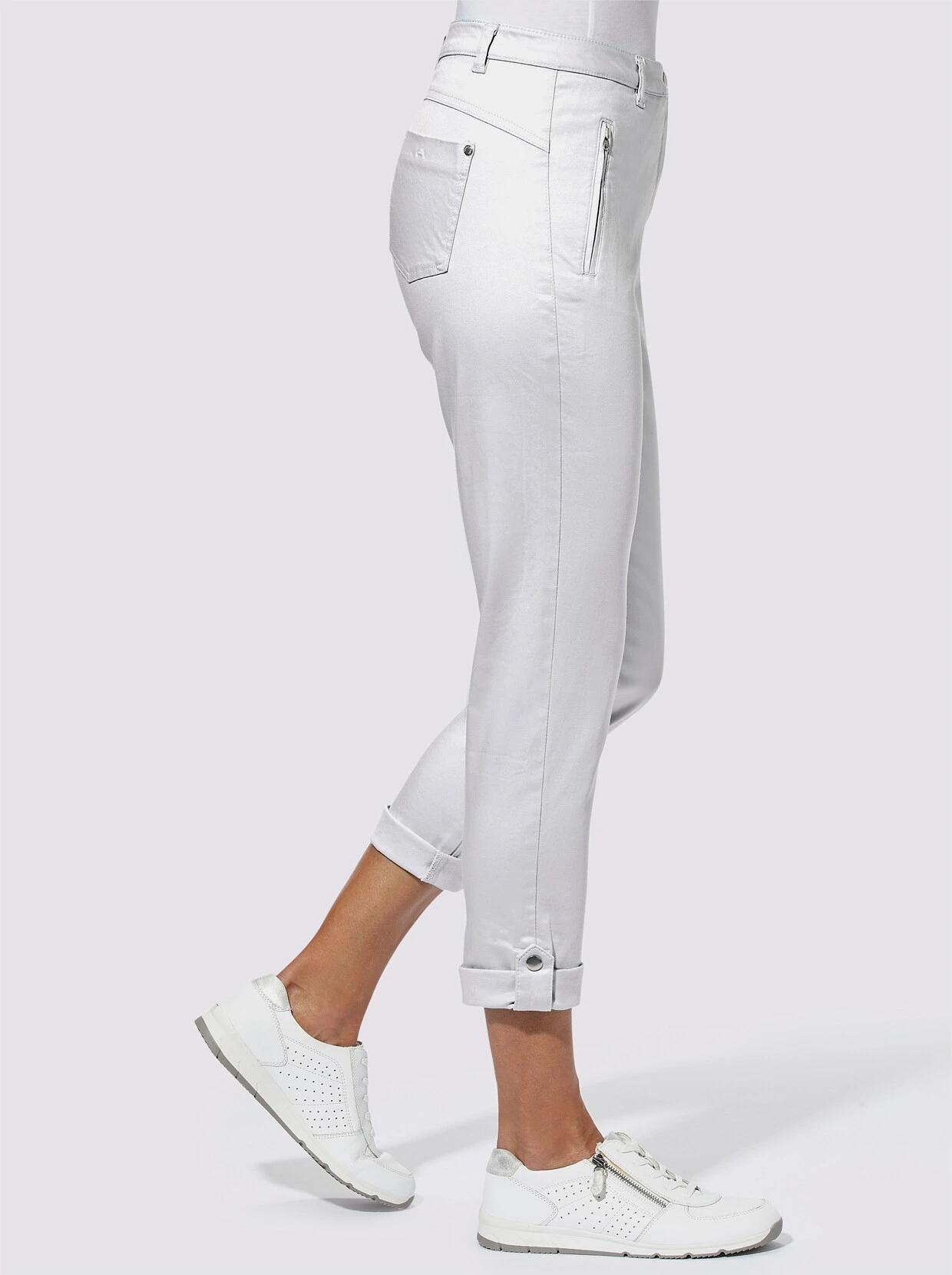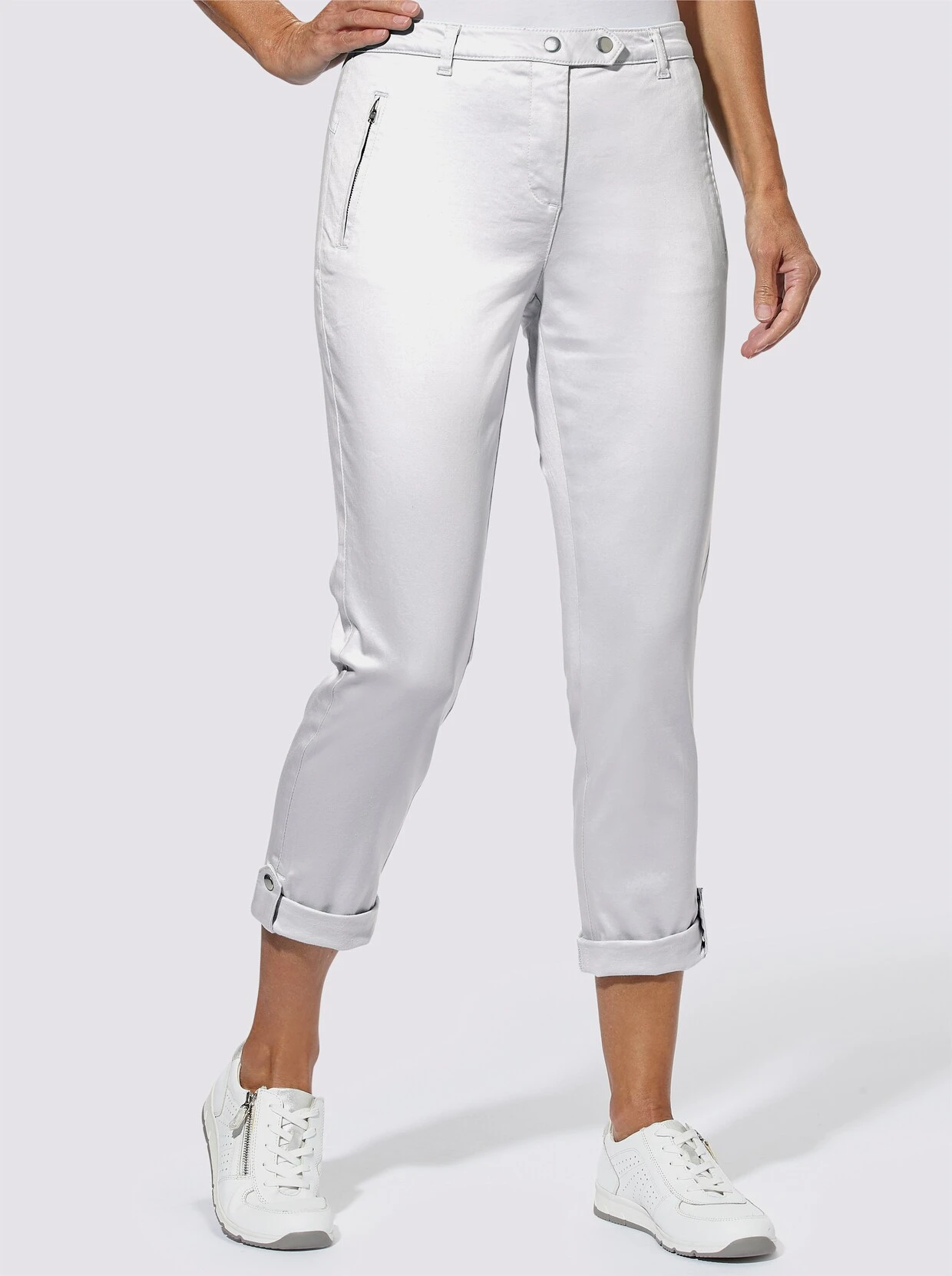 In bequemer Stretch-Qualität: Diese Capri-Hose lässt sich wunderbar zur aktuellen Sommermode kombinieren! 2 Reißverschluss-Taschen vorne, 2 Gesäßtaschen. Formbund mit Gürtelschlaufen sowie Knopf- und Reißverschluss vorne. Der schmale Umschlag am Saum wird mit Riegel und Druckknopf fixiert. Fußweite ca. 36 cm.