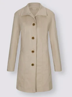Ein Klassiker wurde hier neu und lässig interpretiert: etwas länger geschnittene Jacke im Trenchcoat-Stil. Der Umlegekragen kann auch zum schützenden Stehkragen hochgestellt werden. Schulterpolster. Figurformende Teilungsnaht in der Taille. Durchgehende Knopfleiste mit kontrastfarbigen Knöpfen, 2 Taschen. Gehschlitz hinten.