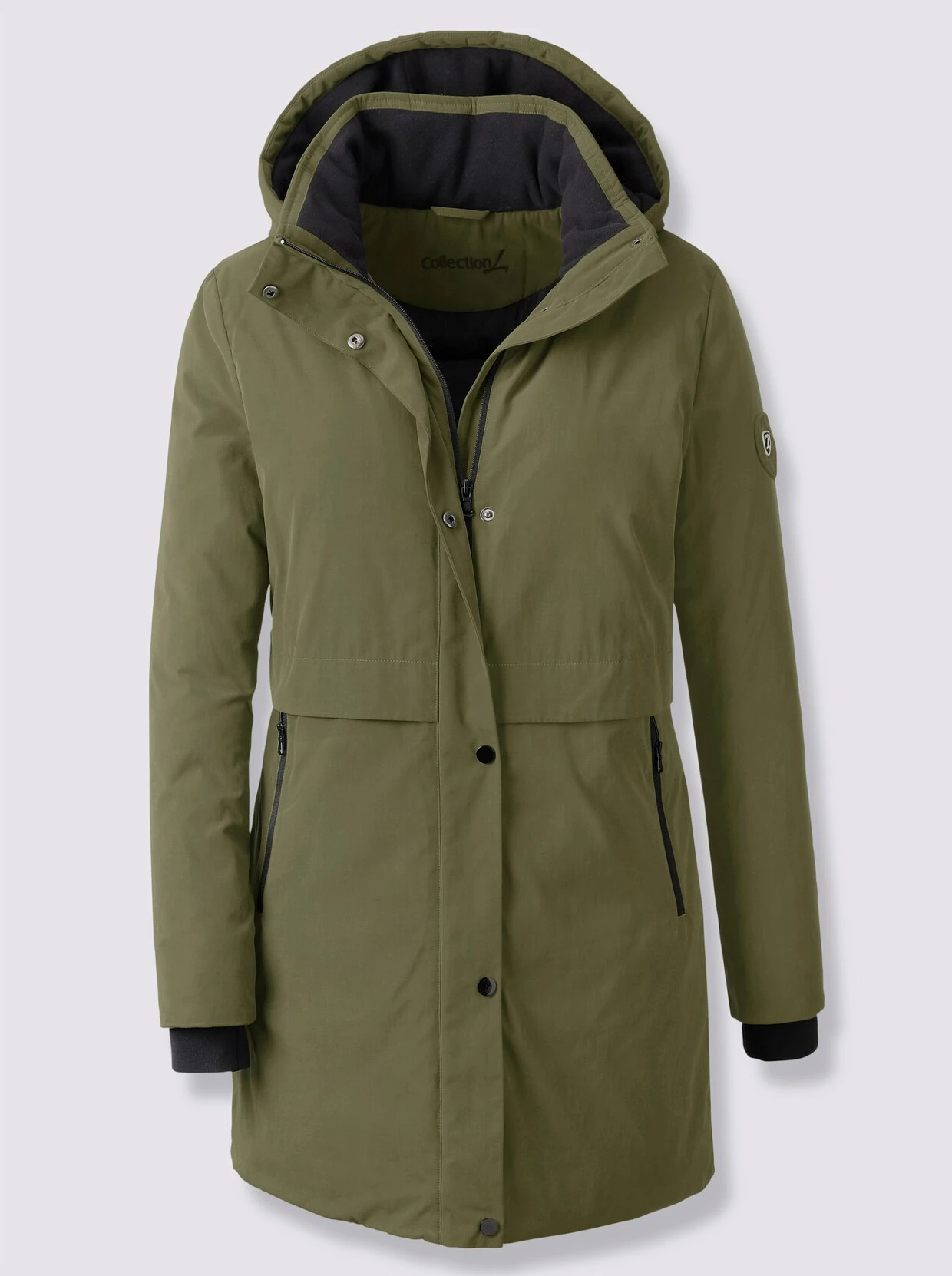 Diese Longjacke ist etwas länger geschnitten und hält so Po und Oberschenkel angenehm warm. Schwarzes Fleece-Futter an der Innenseite der abzippbaren Kapuze und im Kragen. Lange Ärmel mit elastischen Strickbündchen. Verdeckter, durchgehender Reißverschluss mit zusätzlicher Druckknopfleiste. Zierblende in der Taille, 2 Reißverschluss-Taschen, 1 Innentasche. Wattierte Qualität.
