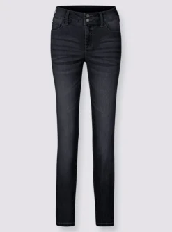Die sitzt einfach perfekt und mogelt sogar optisch ein paar Kilo weg! Jeans in 5-Pocket-Form mit Nietenverzierung an den Taschen. Mit angenehm breitem Bund, Gürtelschlaufen sowie 2-Knopf- und Reißverschluss vorne. Bequeme Beinweite. Fußweite ca. 40 cm.