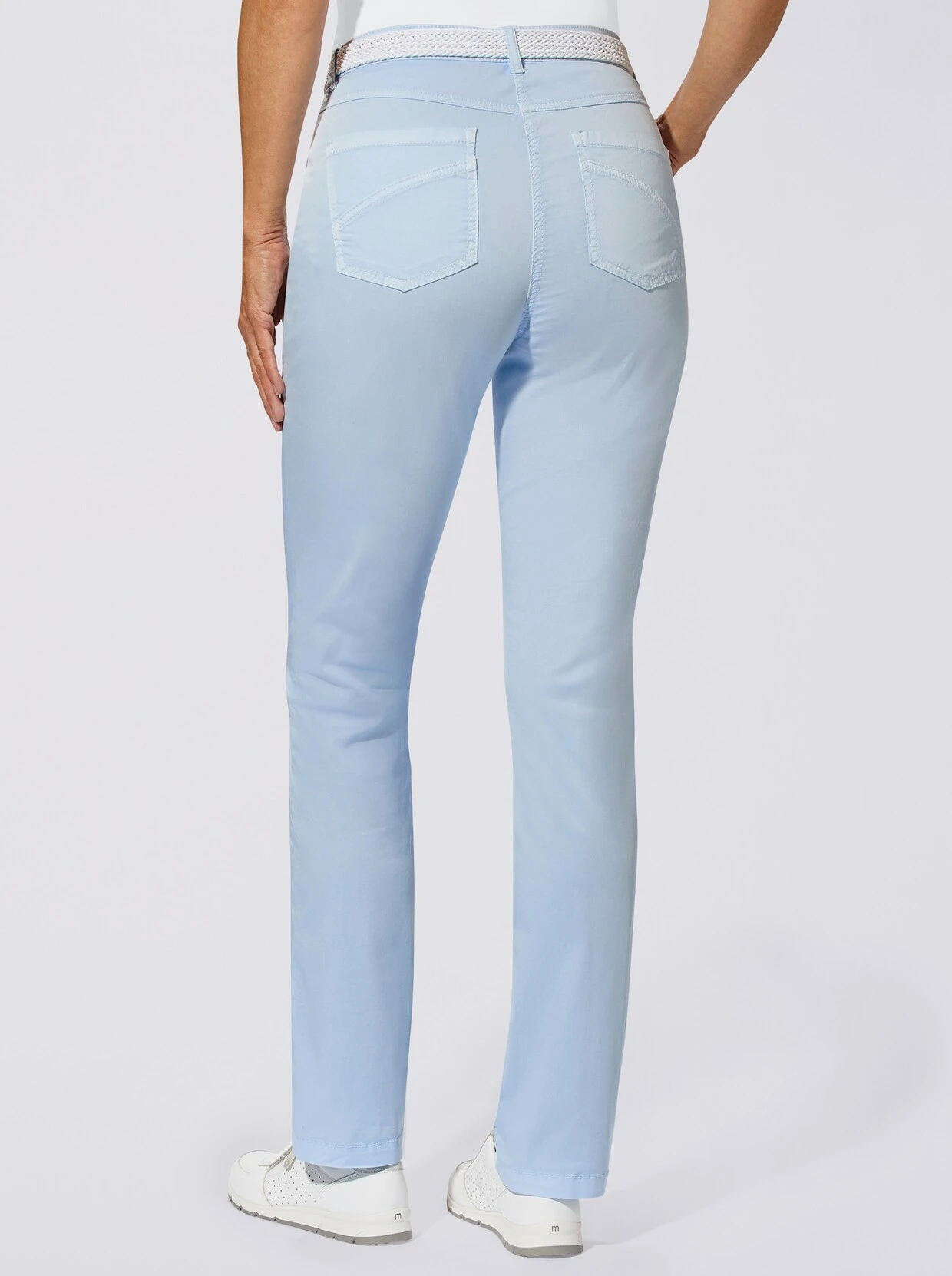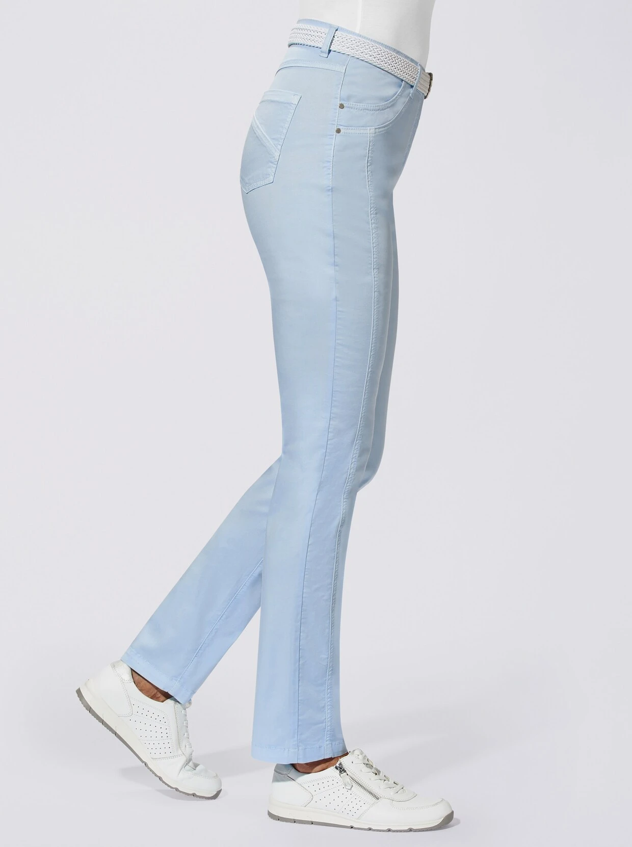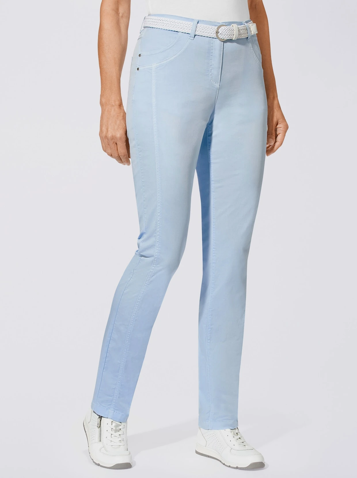 Leichte Baumwoll-Qualität – perfekt an warmen Tagen! Jeans mit optisch streckenden Nähten im Vorderteil. Gürtelschlaufen mit Knopf- und Reißverschluss vorne. 2 Taschen vorne und 2 Gesäßtaschen mit Ziernähten. Rückwärtiger Sattel für einen optimalen Sitz. Fußweite ca. 36 cm. Ohne Gürtel.
