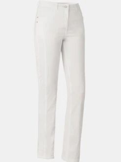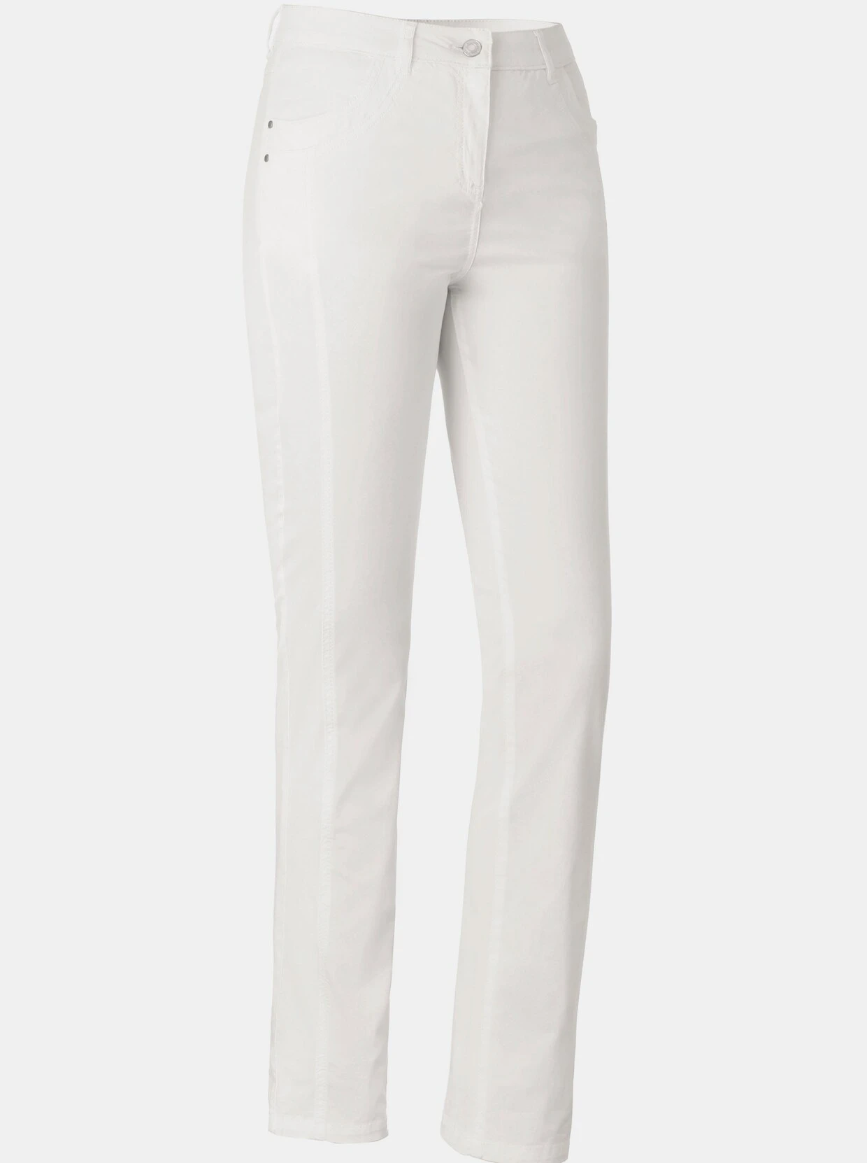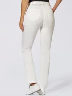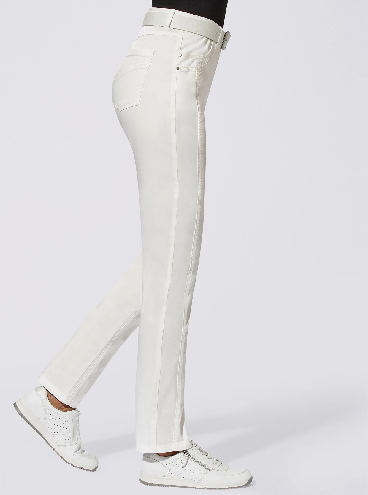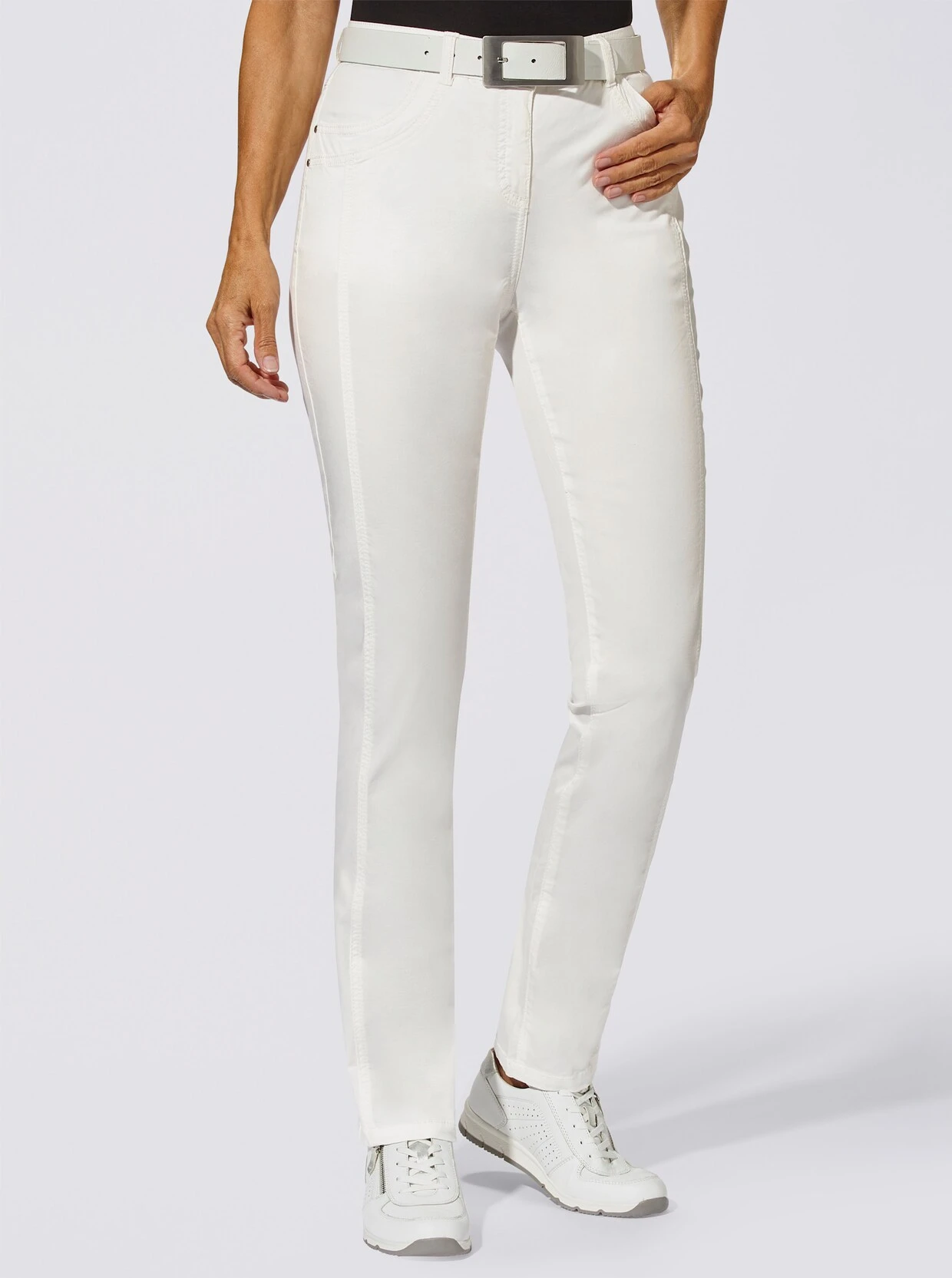 Leichte Baumwoll-Qualität – perfekt an warmen Tagen! Jeans mit optisch streckenden Nähten im Vorderteil. Gürtelschlaufen mit Knopf- und Reißverschluss vorne. 2 Taschen vorne und 2 Gesäßtaschen mit Ziernähten. Rückwärtiger Sattel für einen optimalen Sitz. Fußweite ca. 36 cm. Ohne Gürtel.