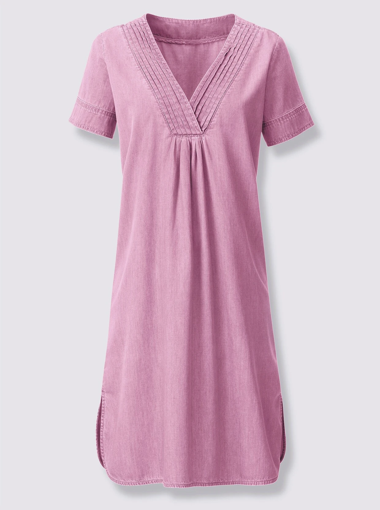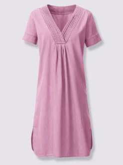 Ein Figurschmeichler durch und durch: Kleid in moderner Denim-Optik. V-Ausschnitt verstärkt durch eine breite Blende mit schöner Biesenverzierung. Durch die Falten unterhalb fällt der Stoff angenehm locker über die Figur. Abgerundeter Saum mit Seitenschlitzen.