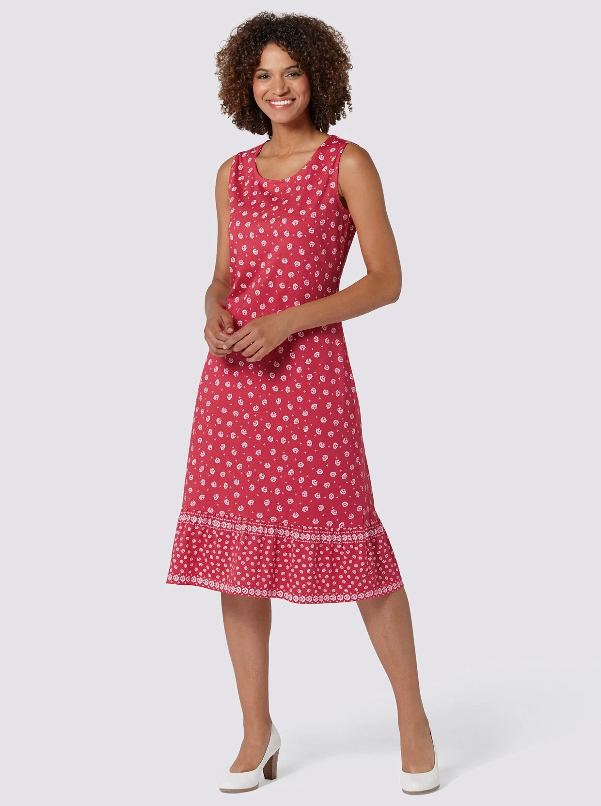 Praktisches und zugleich figurschmeichelndes Kleid zum Reinschlüpfen. Mit breiten Trägern, damit kein BH-Träger hervorschaut. Der Schnitt ist bewusst gerade und schlicht, so fällt es in jeder Konfektionsgröße kaschierend, weil sich nichts abzeichnen kann. Der breite Volant am Saum umspielt kräftige Waden. Bequeme und blickdichte Single-Jersey-Qualität, daher ist kein Innenfutter nötig.