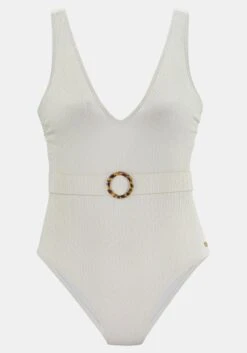 Stilvoller Badeanzug von Jette, kreiert von der Designerin Jette Joop. Struktur-Optik. Formende, herausnehmbare Cups. Rückenausschnitt in V-Form. Tolle Kombi für Urlaub und Badesaison. Aus elastischer Strukturware. Inkl. Ziergürtel mit Schnalle in Hornoptik.