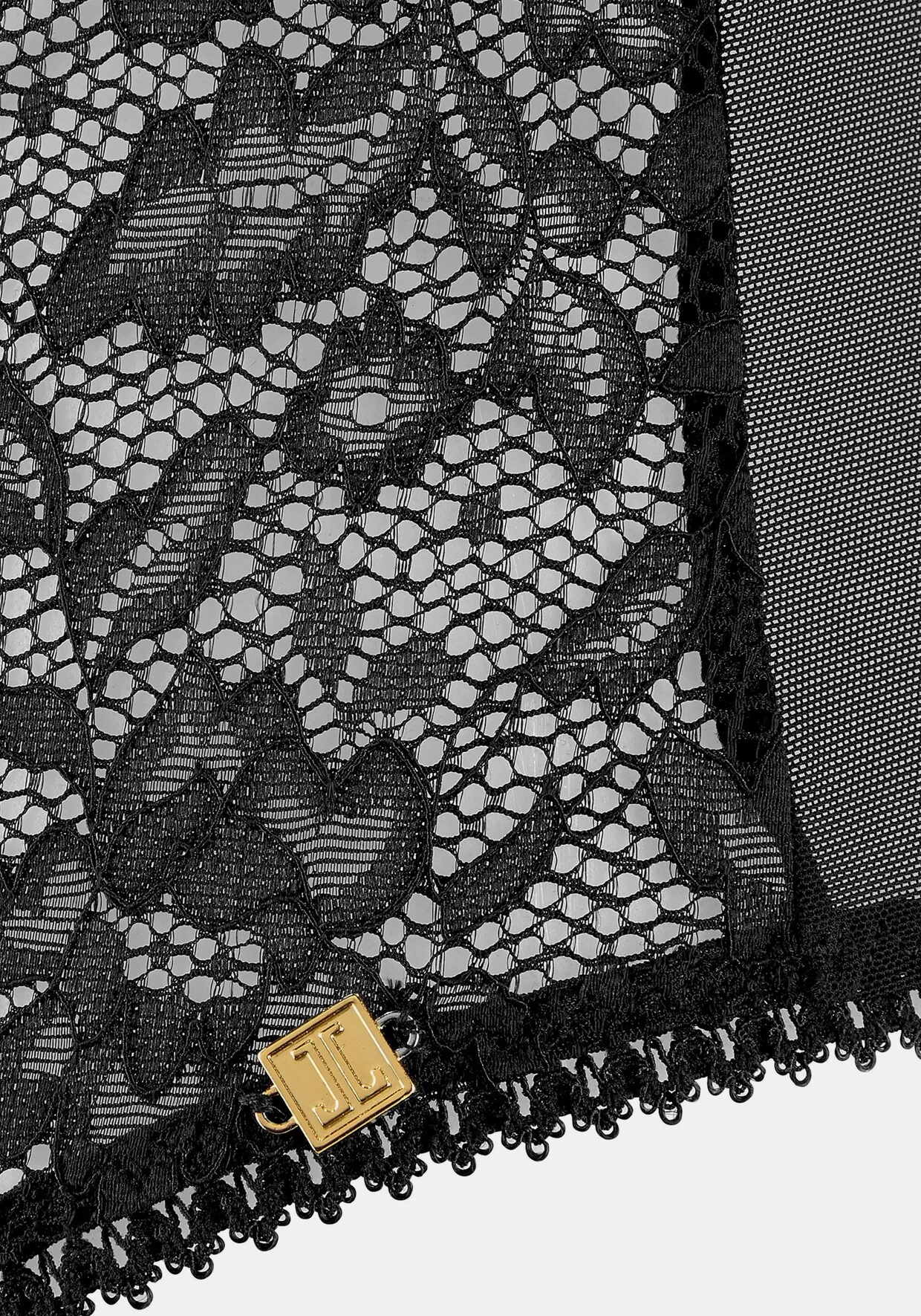 Body von JETTE, kreiert von der Designerin Jette Joop. Vorne aus eleganter Spitze gearbeitet, hinten aus leicht transparenter Mesh-Ware, im Schritt aufknöpfbar, mit Baumwollzwickel. Raffinierter Rückenausschnitt. Aus 90% Polyamid, 10% Elasthan