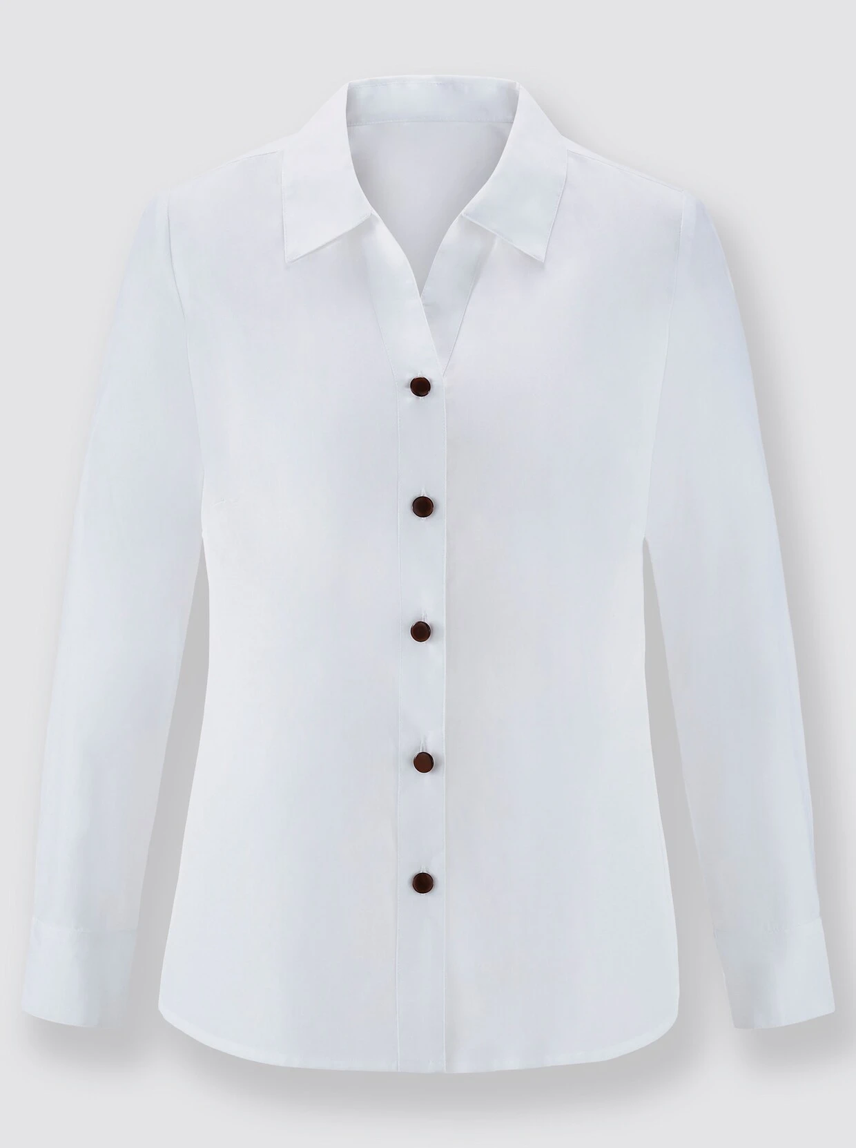 Die gehört in jeden Kleiderschrank! Kombistarke Bluse mit Hemdkragen, kleinem V und langen Ärmeln mit Knopfmanschette. Die kontrastfarbenen Knöpfe setzen Akzente. Die Brustabnäher und die Schulterpasse hinten sorgen für perfekte Passform, die Kellerfalte hinten für viel Bewegungsfreiheit. Gerader Saumabschluss. Herrlich pflegeleicht und bügelarm dank Easy-Care-Ausrüstung.