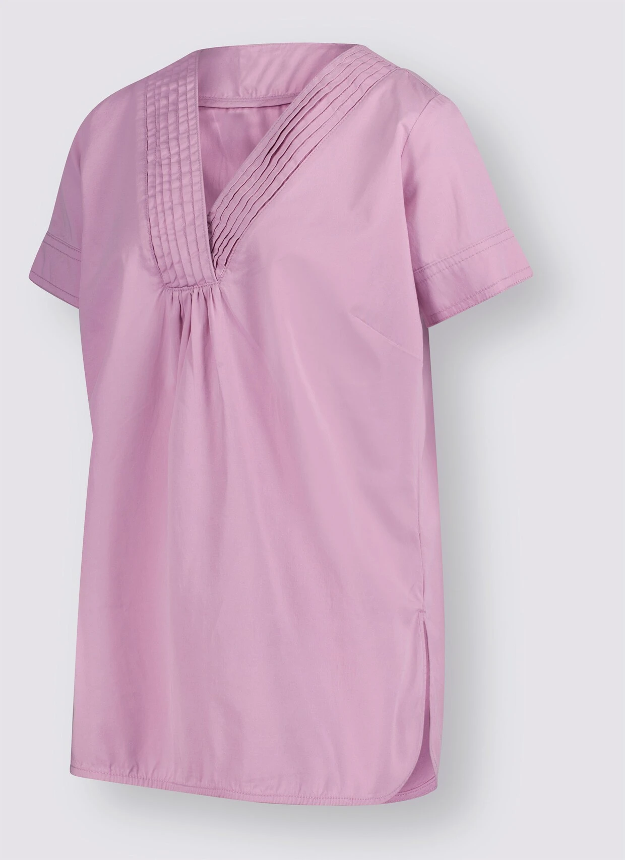 Wir lieben Denim! Luftige Bluse mit tiefem V-Ausschnitt. Besonderer Hingucker ist die Blende mit Biesenverzierung. Brustabnäher sorgen für eine perfekte Passform. Durch die Falten unterhalb des Ausschnitts fällt der Stoff weit und kaschierend. Abgerundeter Saum mit Seitenschlitzen.