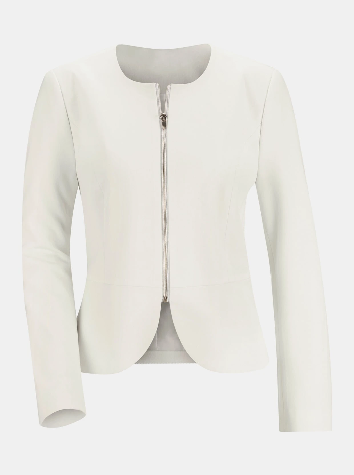 Der Blazer besticht durch seine schlichte Eleganz! Der feminine Schnitt in modisch leicht verkürzter Form bietet viele Teilungsnähte, die ihm eine hervorragende Passform verleihen. Der angedeutete Schößchen-Saum ist elegant abgerundet. Mit Schulterpolstern und durchgehendem Reißverschluss.