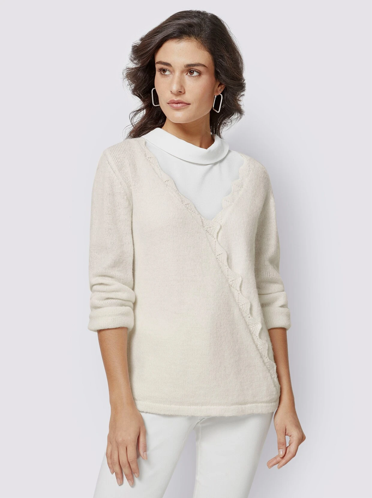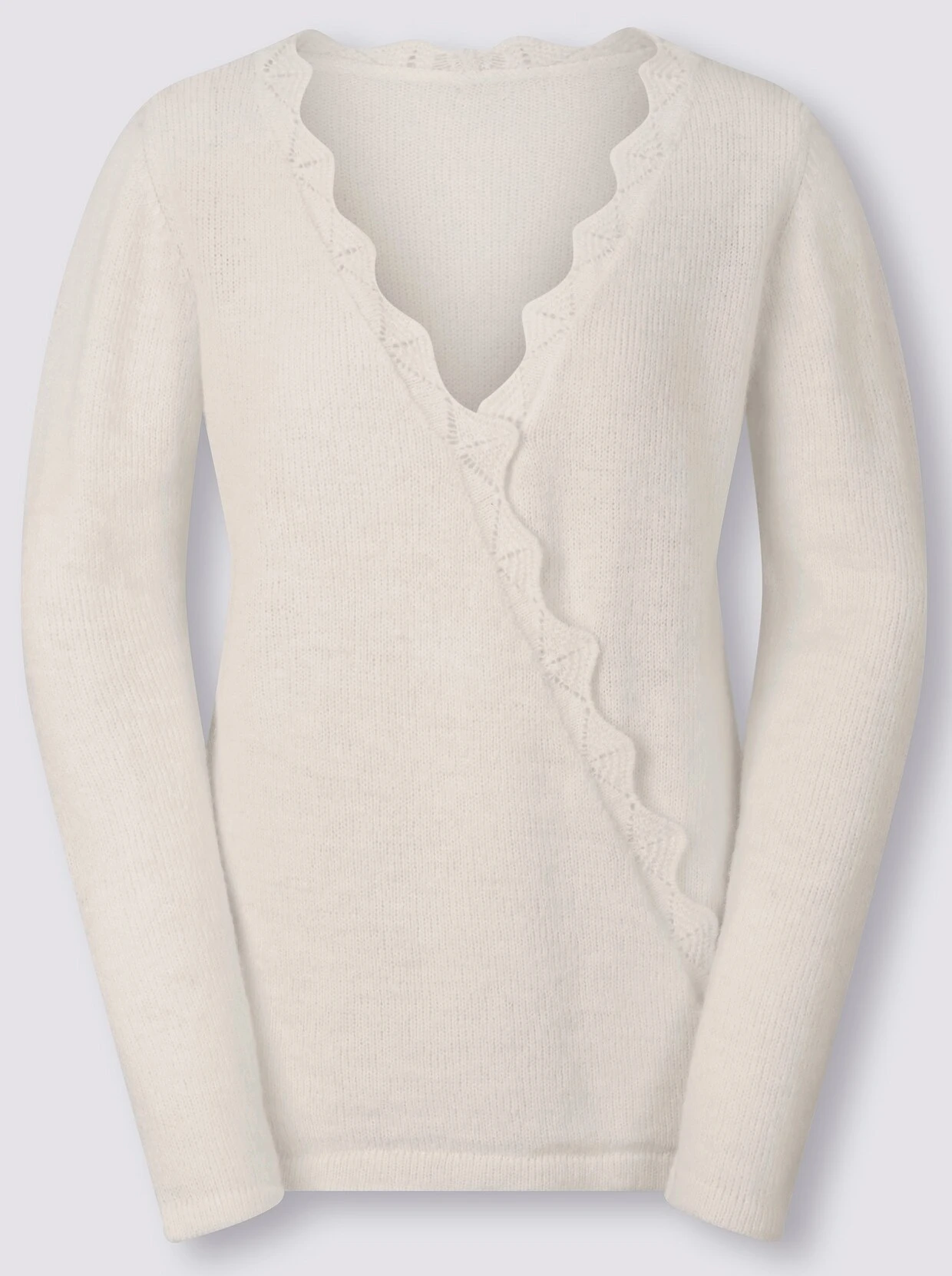 Der Pullover betont durch die am Saum fixierte Wickelform mit eleganten Wellenkanten in Ajourstrick perfekt Ihre Figur. Mit langen Ärmeln. Sorgfältig in Form gearbeitet. Geschmeidige, weiche Feinstrick-Qualität.