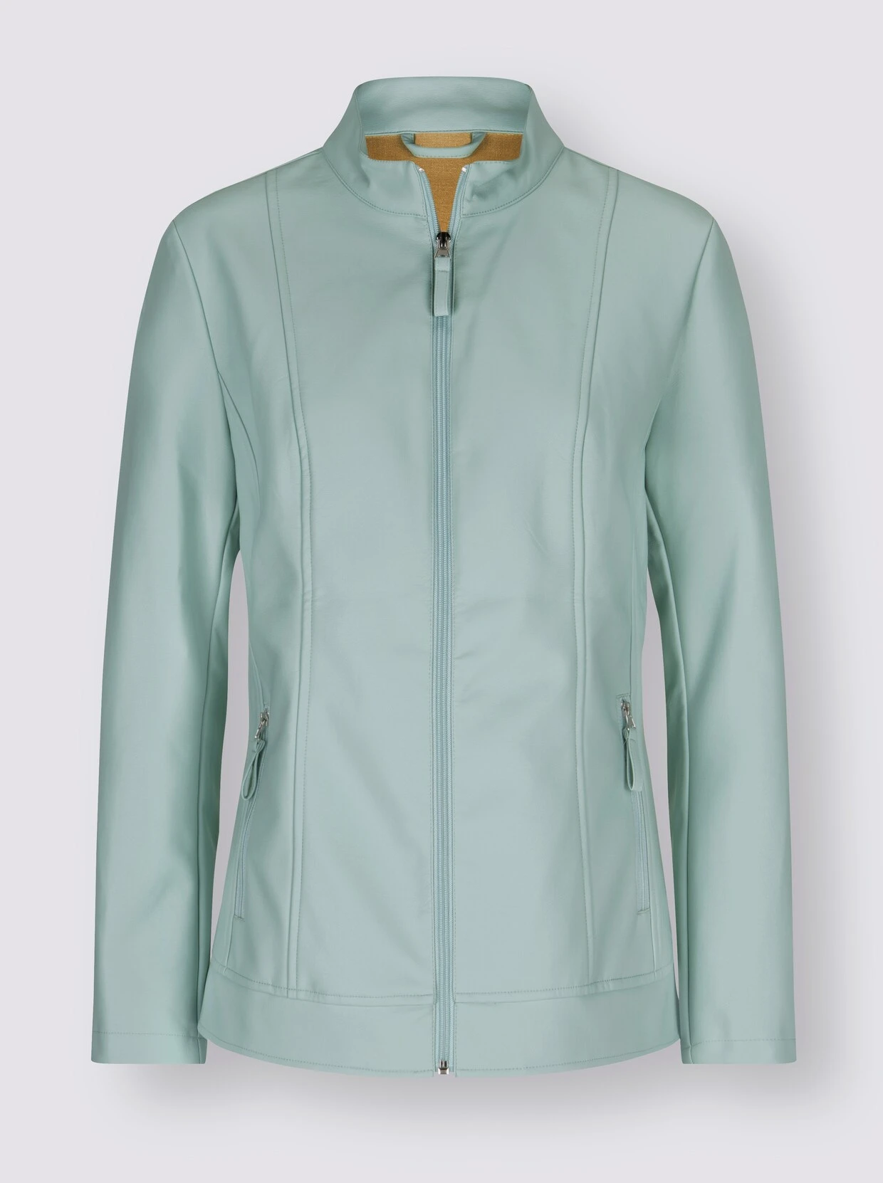Topmodischer Hingucker aus wunderbar weichem Leder-Imitat: attraktive Jacke mit Stehkragen und Reißverschluss. 2 Nahttaschen. Die Wiener Nähte sorgen für eine tolle Passform und strecken zusammen mit den längs verlaufenden Ziernähten zudem optisch. PU-beschichtet.