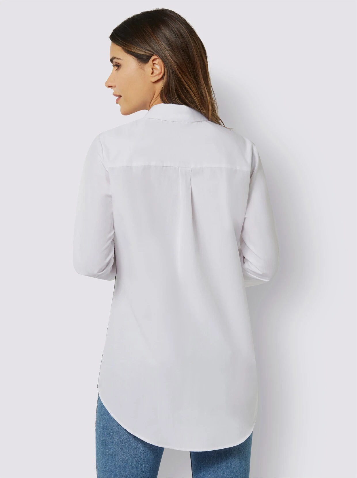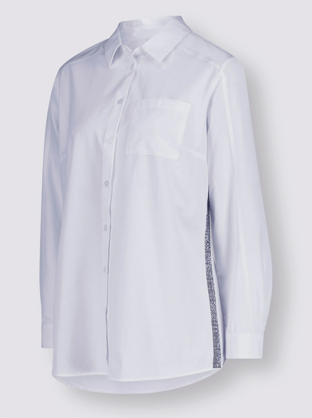 Diese Longbluse ist kombistark, figurschmeichelnd und macht zudem solo eine ebenso gute Figur wie unter Pullundern oder Strickjacken! Für etwas Glamour sorgen die Glitzersteinchen entlang einer Seitennaht. Mit Hemdkragen, durchgehender Knopfleiste, aufgesetzter Brusttasche und langen Ärmeln mit Knopfmanschette. Rückenpasse mit Kellerfalte für die schmeichelnde Weite. Hinten länger geschnitten und mit abgerundetem Saum. In trageangenehmer, fließender Qualität.