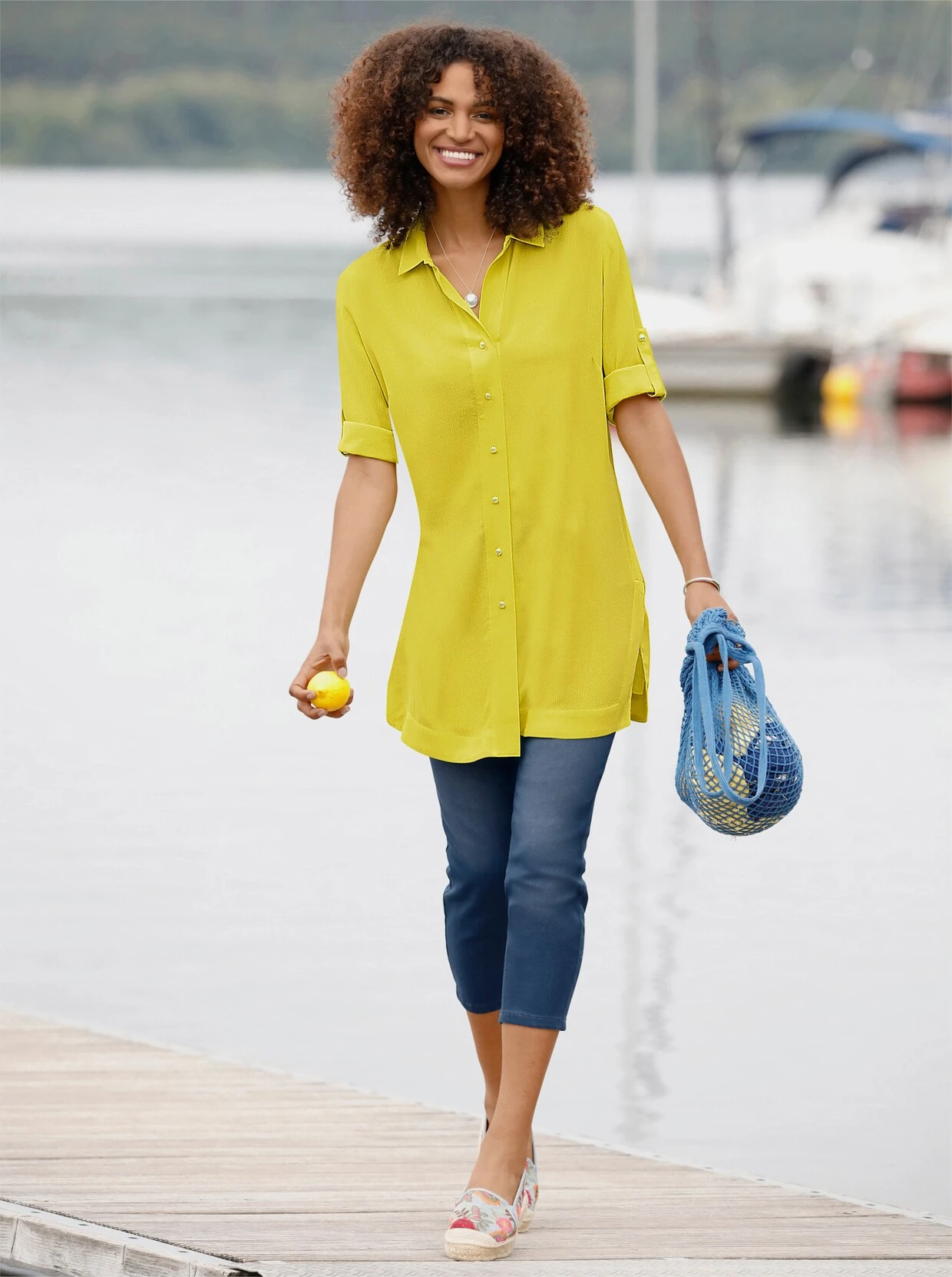 Wow, die Longbluse mit Hemdkragen, kleinem V-Ausschnitt und Knopfleiste zieht die Blicke auf sich! Figurumspielend und streckend die lange Form, effektvoll der Borkenkrepp, variabel die Ärmel mit schmaler Manschette, die dank Riegel und Knopf von 3/4-Länge auf Halbarm gekrempelt werden können. Viel Bewegungsfreiheit schenkt die Falte unter der hinteren Schulterpasse sowie die langen Seitenschlitze am leicht abgerundeten Saum.
