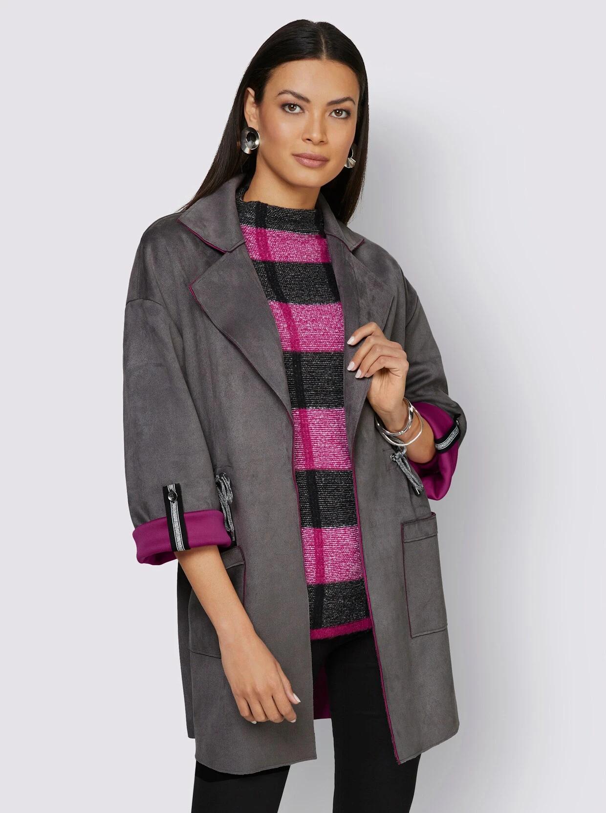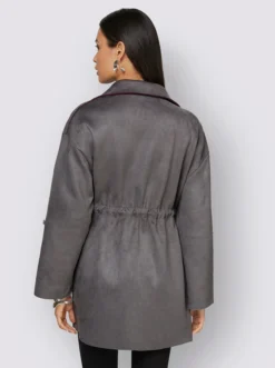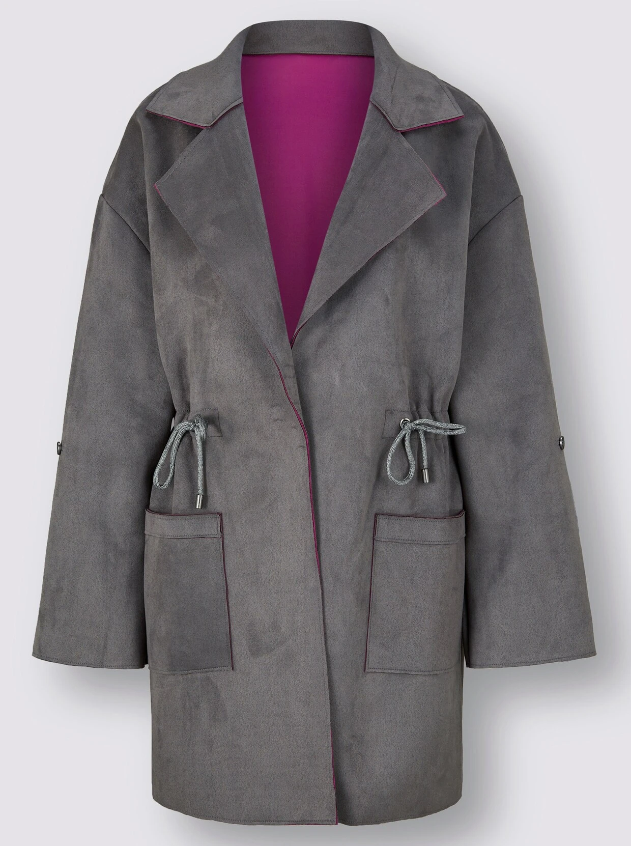 Diese legere Longjacke in Doubleface-Optik ist der perfekte Begleiter in der Übergangszeit. Außen in softem Velourslederimitat zeigt es sich innen mit starker Kontrastfarbe, die beim Krempeln der langen Ärmel ausdrucksvoll zum Vorschein kommt. Ärmel mit Zierriegel und Knopf auf 3/4-Länge zu fixieren. Verschlusslos gearbeitet mit großen Reverskragen und aufgesetzten Taschen. Dank Tunnelzug auf Taillenhöhe mit glitzernder Kordel individuell in der Weite zu regulieren.