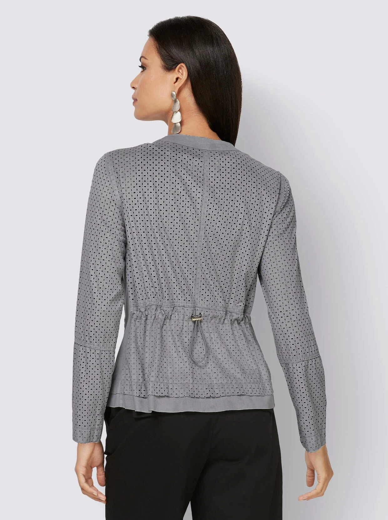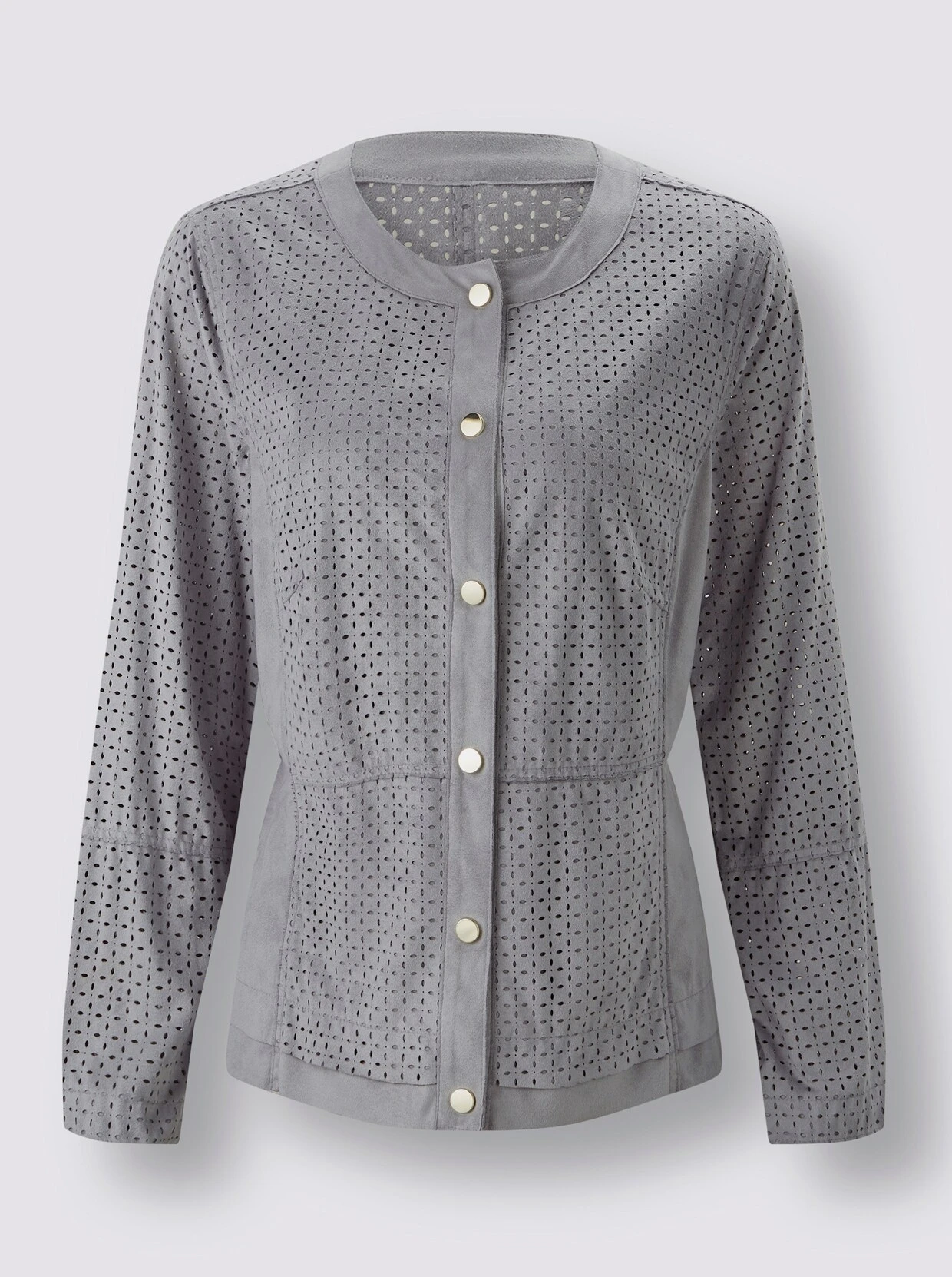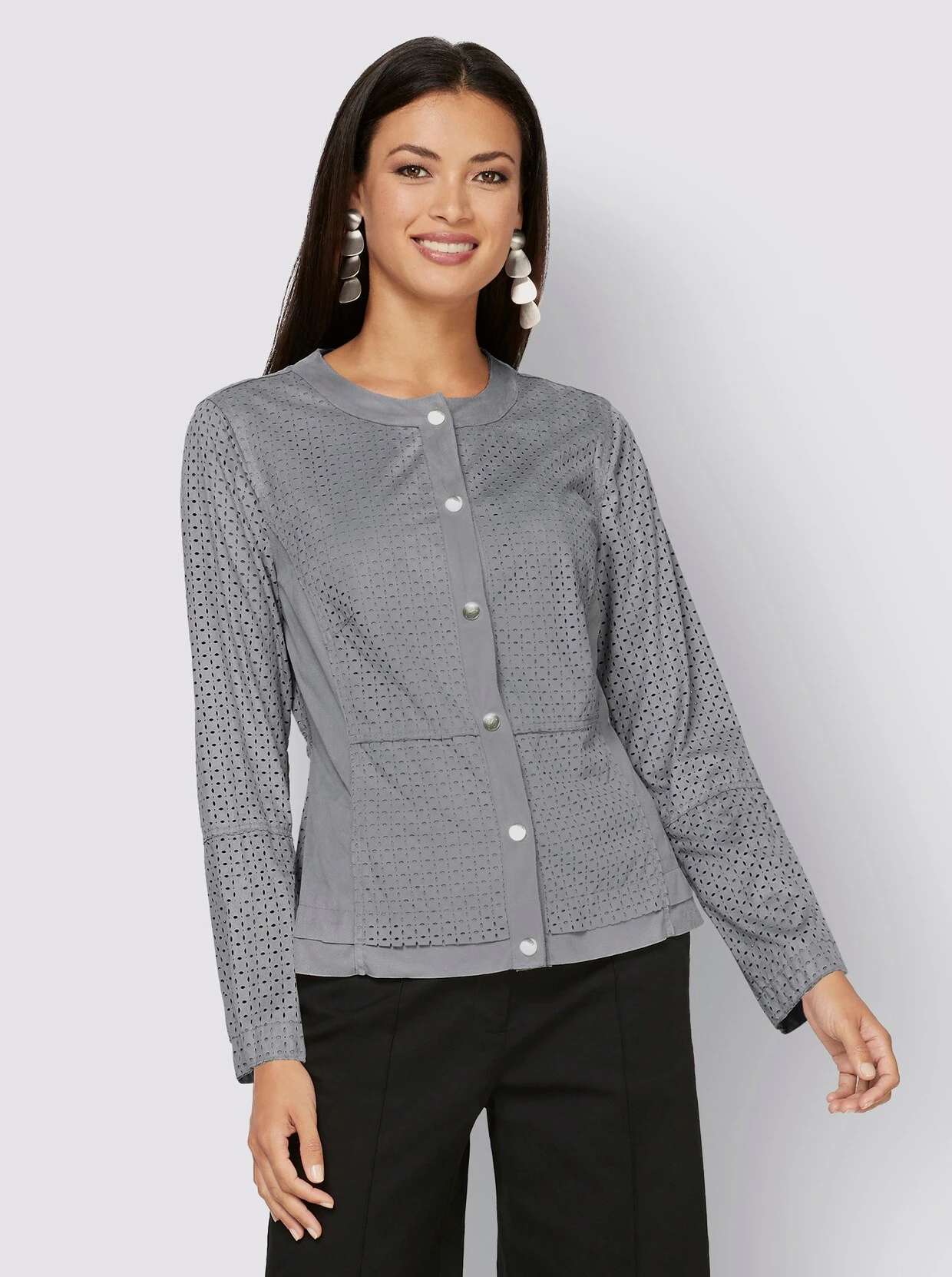 Absolutes Must-have! Der Blazer brilliert durch das handschuhweiche Veloursleder-Imitat mit blickfangstarken Cut-Outs. An den Seiten mit streckenden glatten Partien. Blende am Rundhals-Ausschnitt, entlang der Druckknopfleiste und am Saum. Stiltypische Quer-Teilungsnähte. Auf Taillenhöhe im Rückenteil mit Tunnelzug und Bindeband zur individuellen Weitenregulierung. Das Vorderteil ist doppelt gearbeitet, das Rückenteil erst in der unteren Hälfte ab dem Tunnelzug. So bleibt die Transparenz an den langen Ärmeln erhalten.