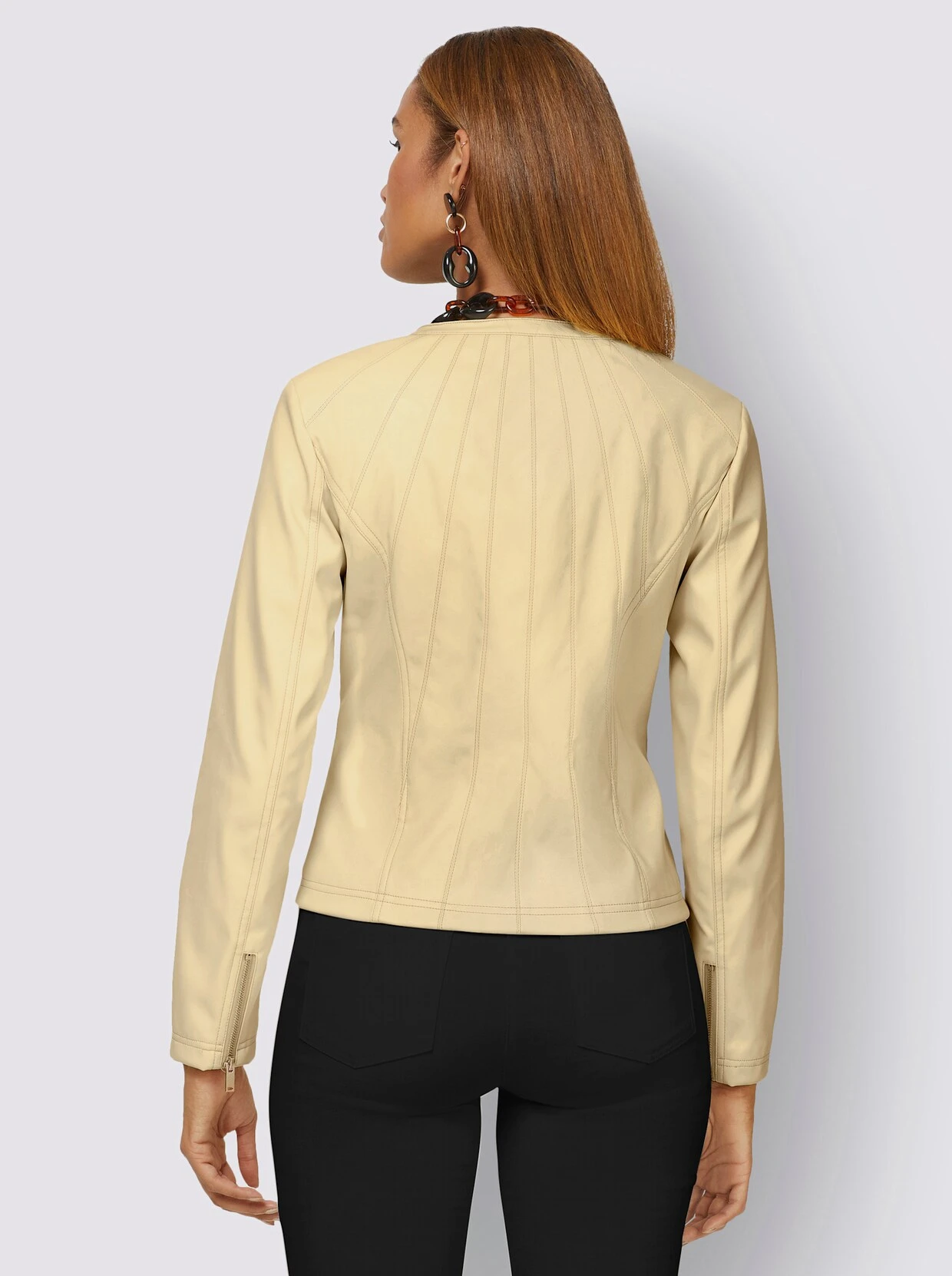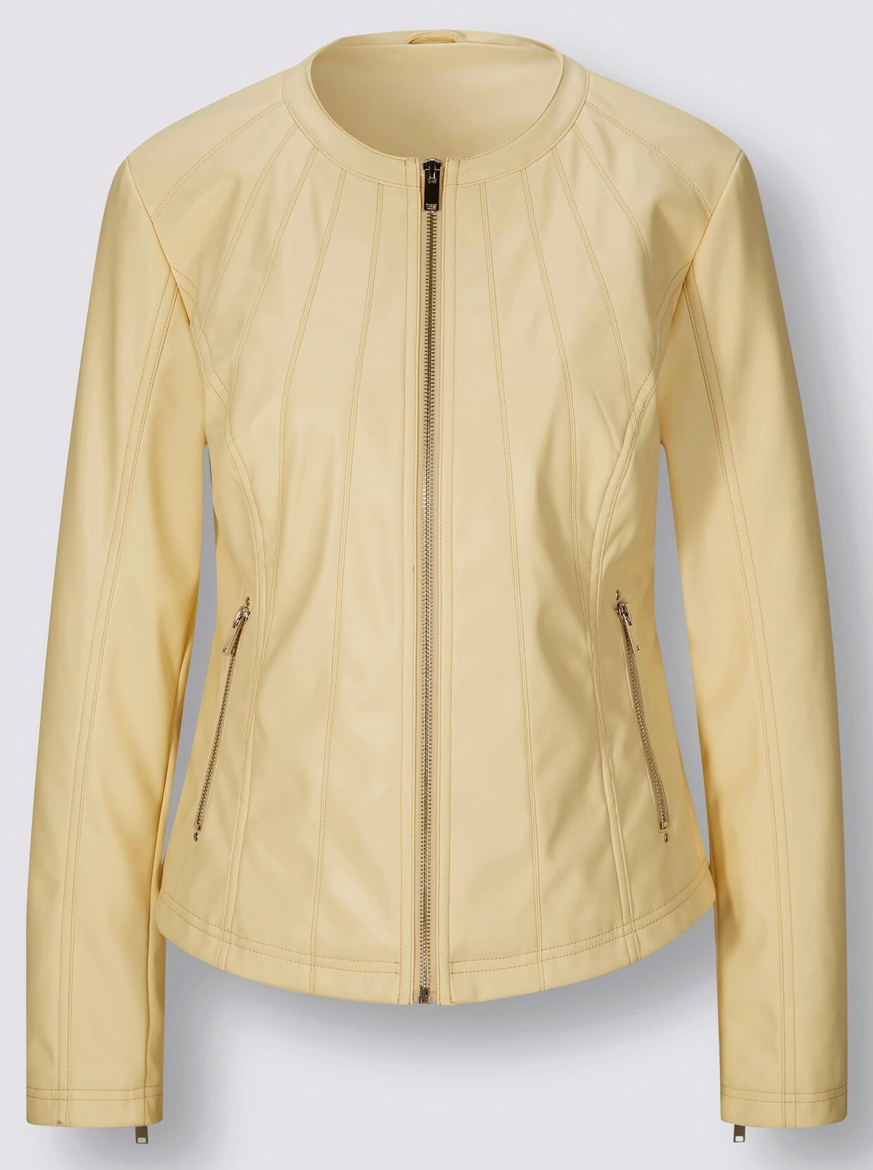 Geheimtipp unter Fashion Fans: Der Blazer aus weichem Lederimitat mit PU-Beschichtung ist von echtem Leder kaum zu unterscheiden. Vorne und hinten verlaufen effektvoll strahlenförmige Ziernähte und verleihen eine tolle Optik. Rundhals-Ausschnitt und goldfarbene Reißverschlüssen vorne, an den Taschen mit Nieten und am Ärmelabschluss. Formgebende Wiener Nähte. Vollständig gefüttert.