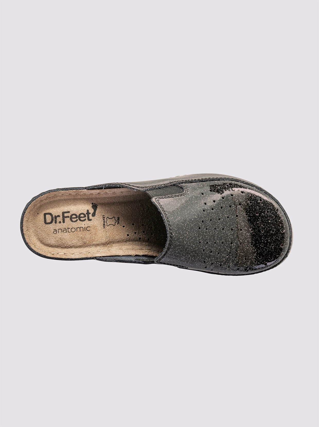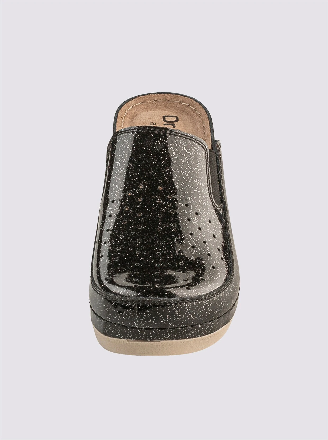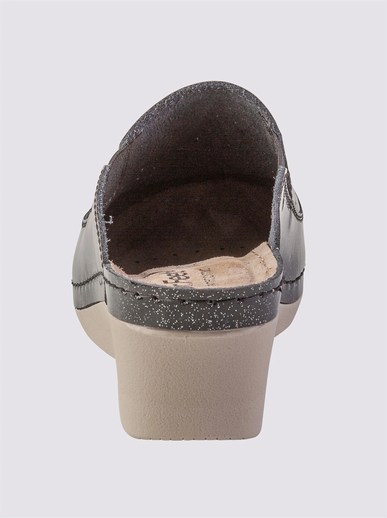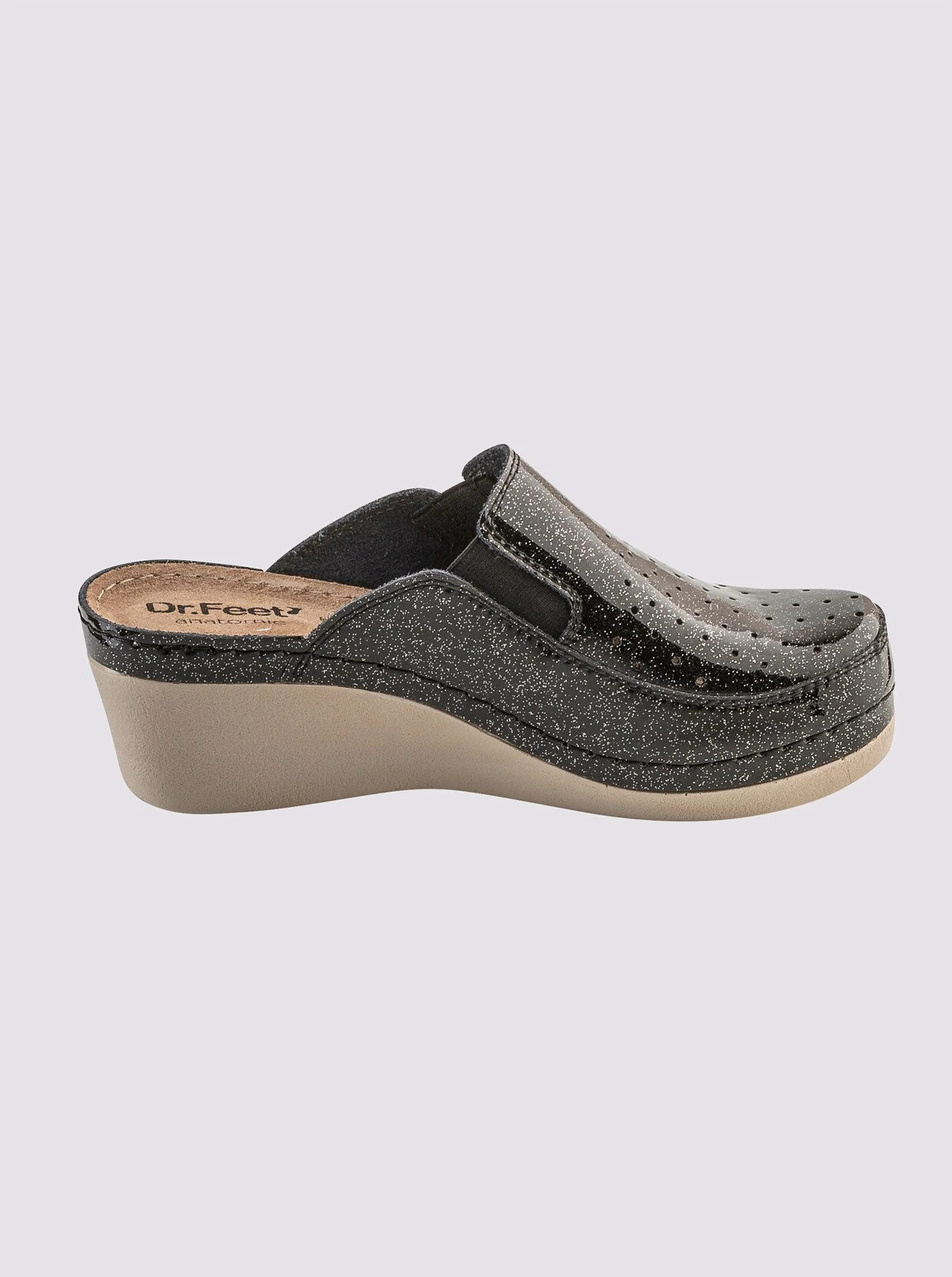Clog Aus Rindleder, mit Glitzerlack-Überzug. Seitliche Stretcheinsätze für mehr Tragekomfort. Gepolsterte Innensohle aus Leder. Flexible Laufsohle. Keilabsatz, Absatzhöhe ca. 45 mm (bei Gr. 37). Weite G.