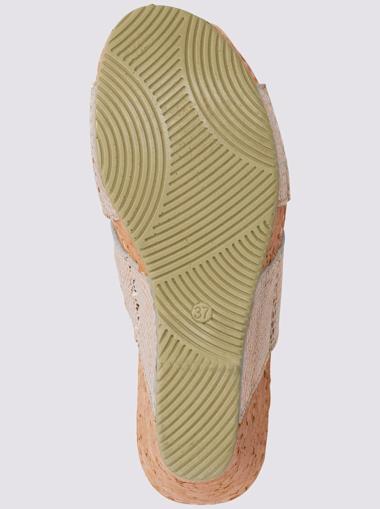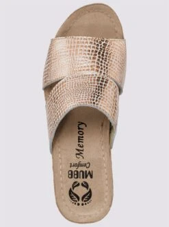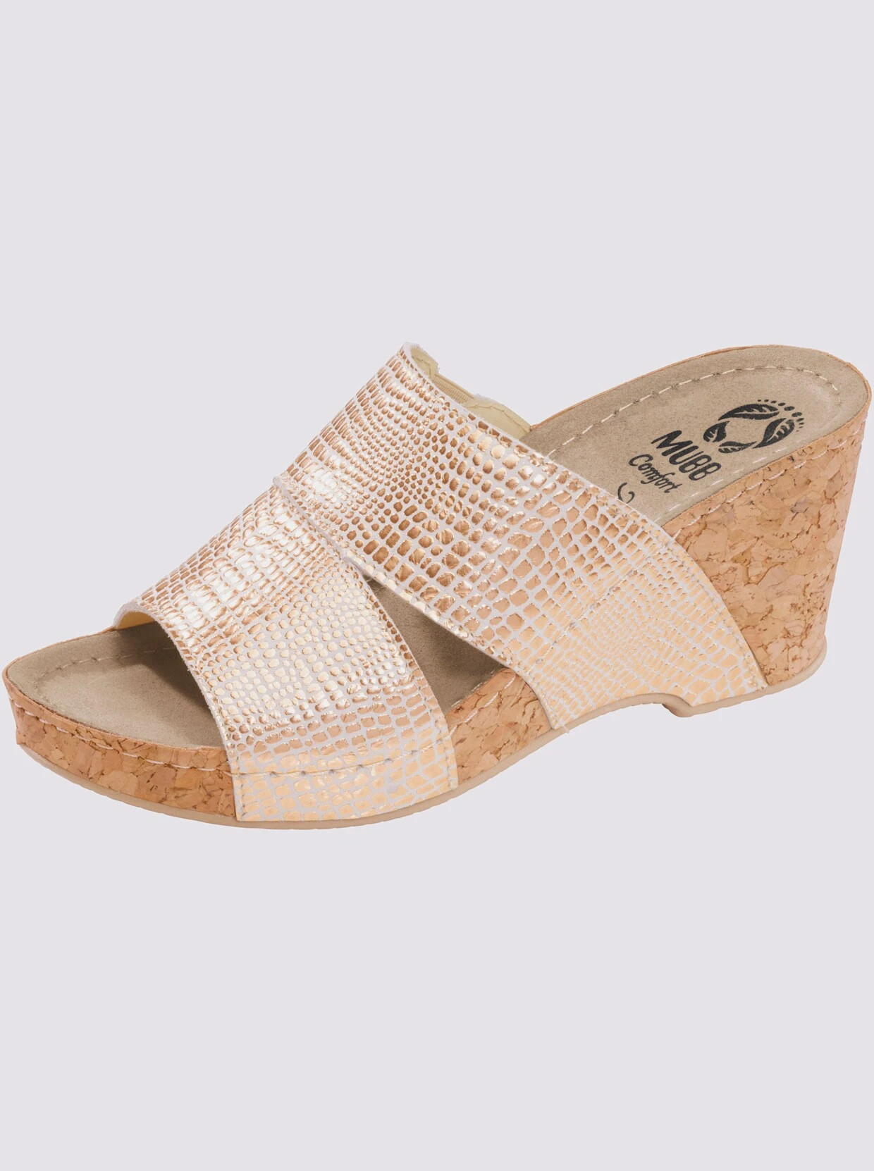 Pantolette MUBB Rindleder mit Animalprägung. Mit lederbezogenem Memory-Fußbett. Keilförmiger Stretcheinsatz an der Innenseite. Angenehme Laufhöhe. Mit Plateau. Absatzhöhe ca. 65 mm.