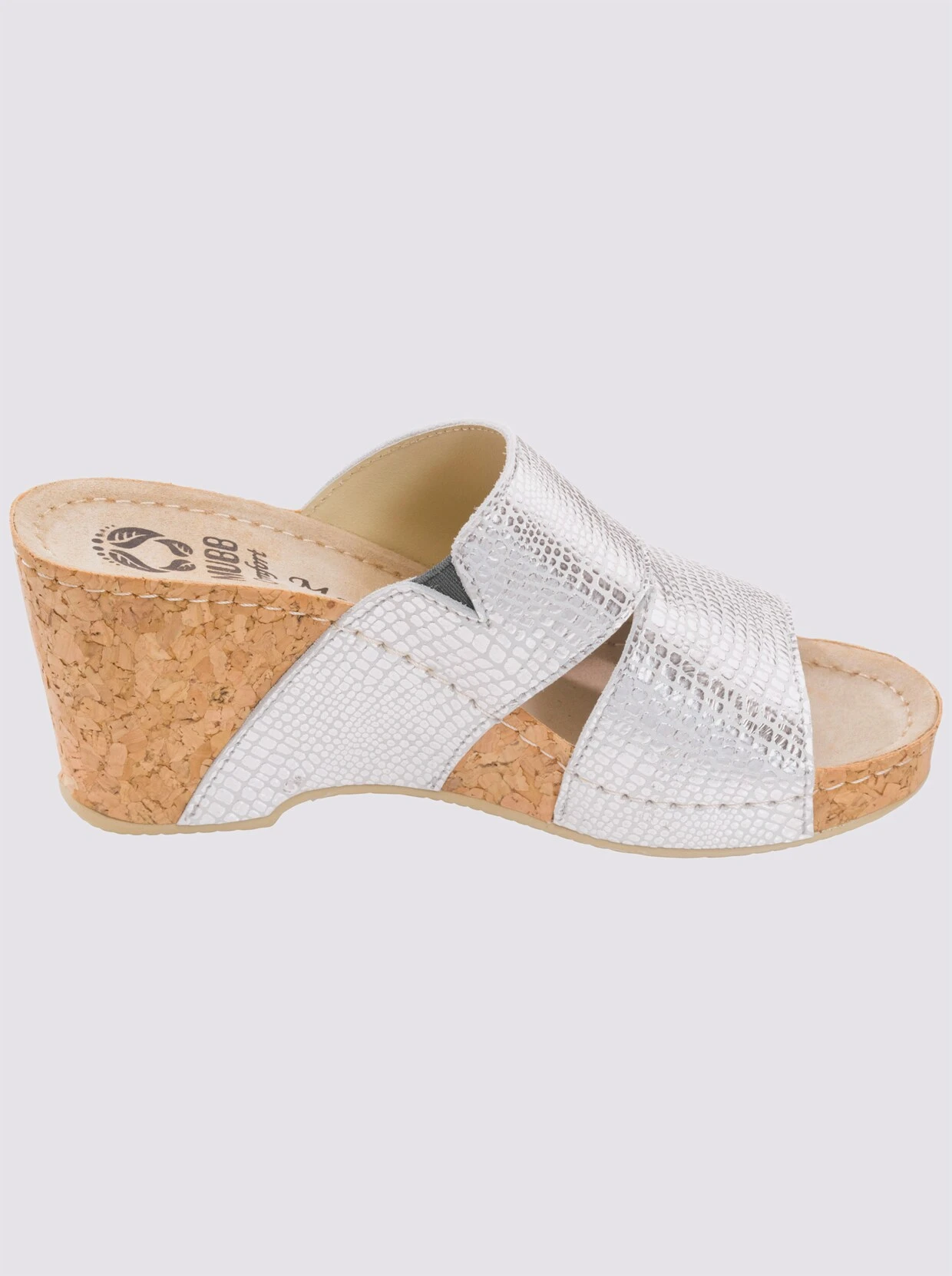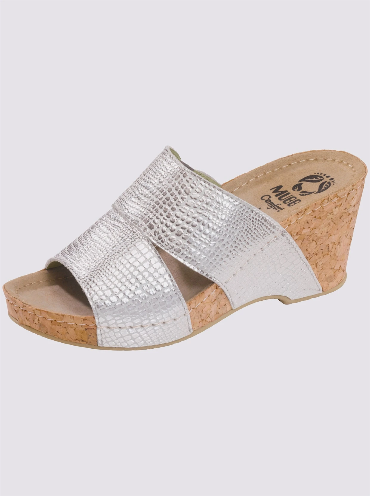 Pantolette MUBB Rindleder mit Animalprägung. Mit lederbezogenem Memory-Fußbett. Keilförmiger Stretcheinsatz an der Innenseite. Angenehme Laufhöhe. Mit Plateau. Absatzhöhe ca. 65 mm.