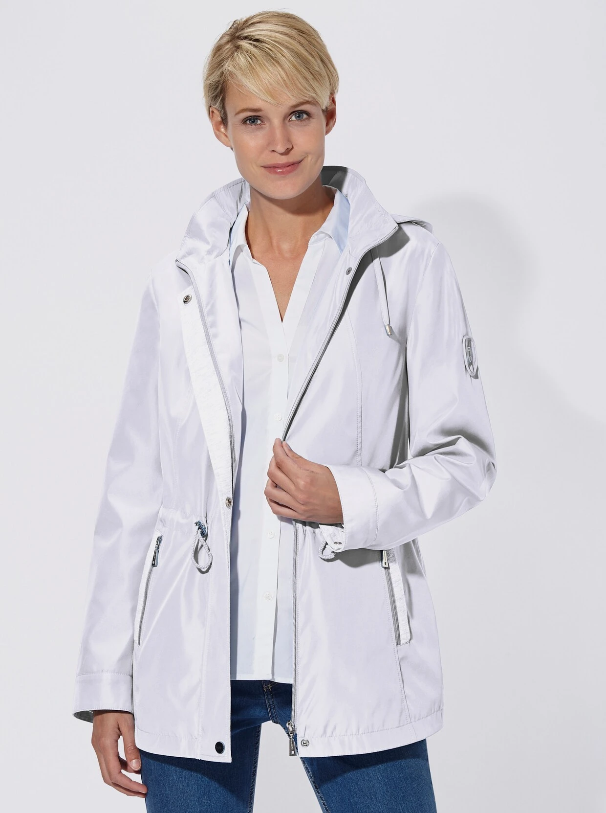 Lässiges Lieblings-Modell für die Übergangszeit: Diese Jacke ist mit vielen schönen Details gearbeitet: kontrastfarbiger Jersey-Besatz an der abzippbaren Kapuze mit Tunnelzug, innen an der Druckknopfleiste, am Ärmelabschluss und an den Taschen. Umlegekragen, durchgehende Druckknopfleiste mit zusätzlichem, verdecktem Reißverschluss, 2 Taschen mit zusätzlichem Zierreißverschluss, 1 knöpfbare Innentasche. Tunnelzug in der Taille, passformgerechte Teilungsnähte im Vorder- und Rückenteil. Ärmelabschluss mit Schlitz und Druckknöpfen.