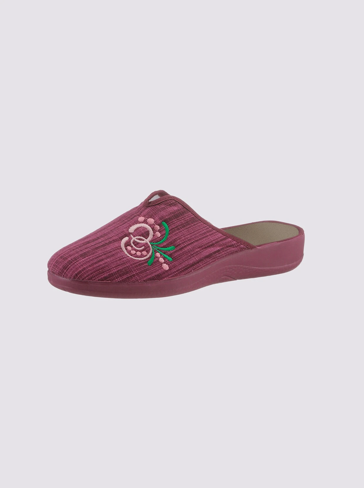 Dieser Pantoffel ist einfach gemütlich. Aus pflegeleichtem Textil mit hübscher Stickerei auf dem Blatt. Weiche Trittdämpfung. Gummi-Laufsohle mit ca. 25 mm Absatz. Weite G.