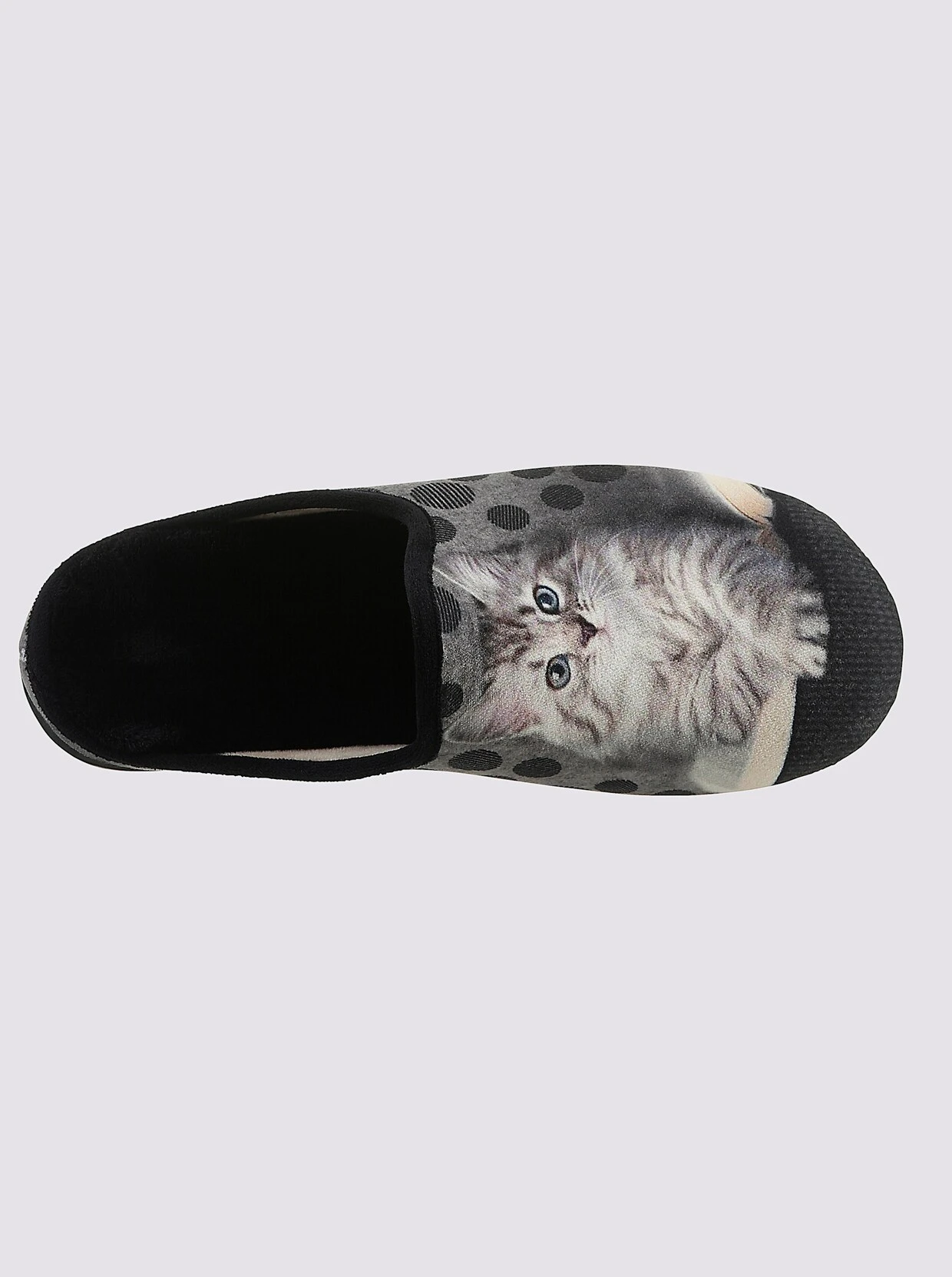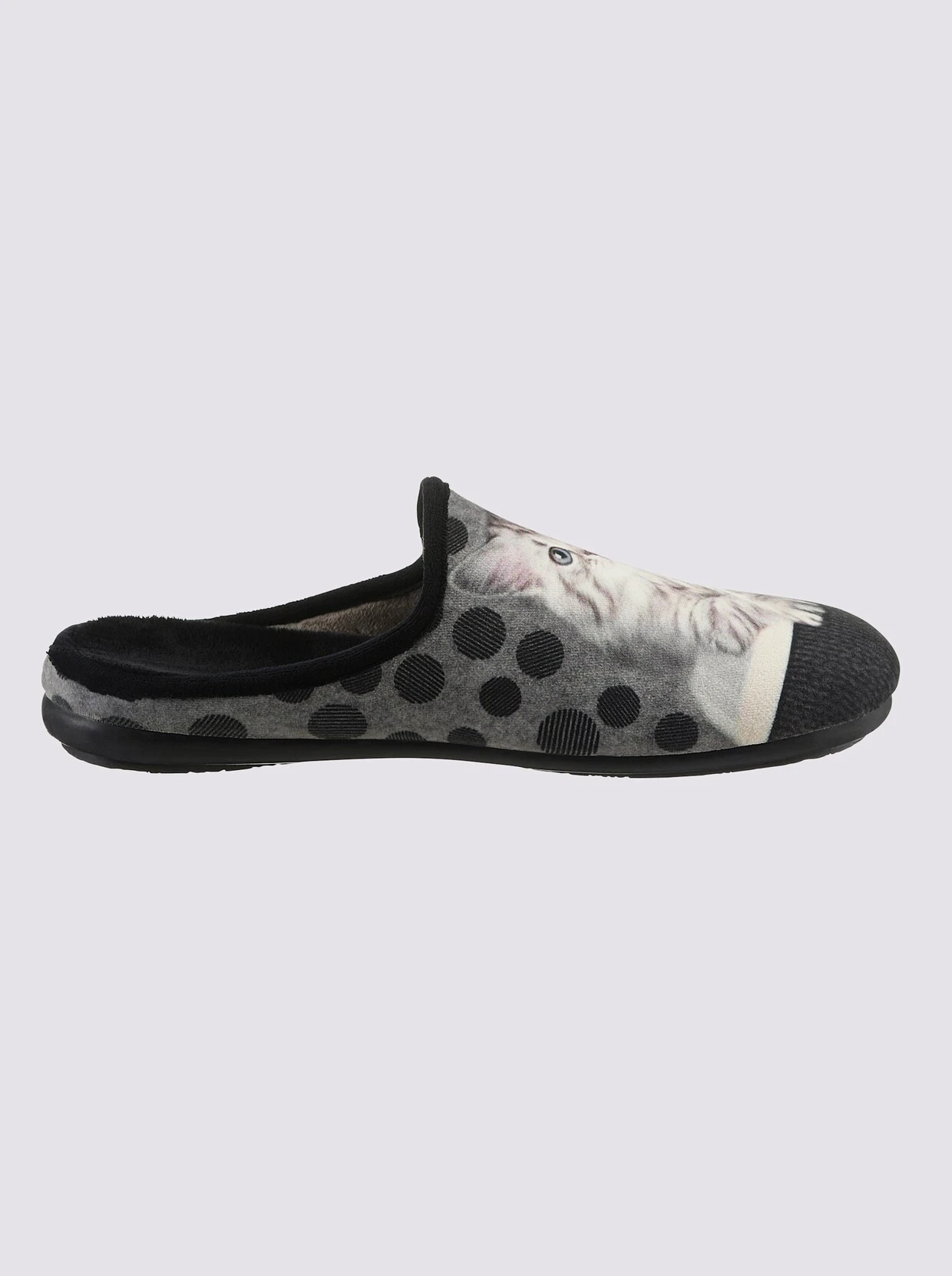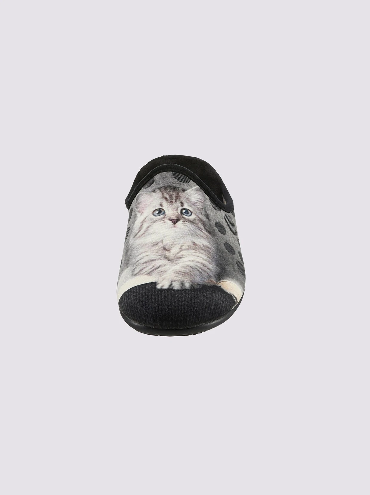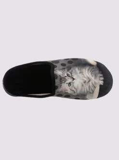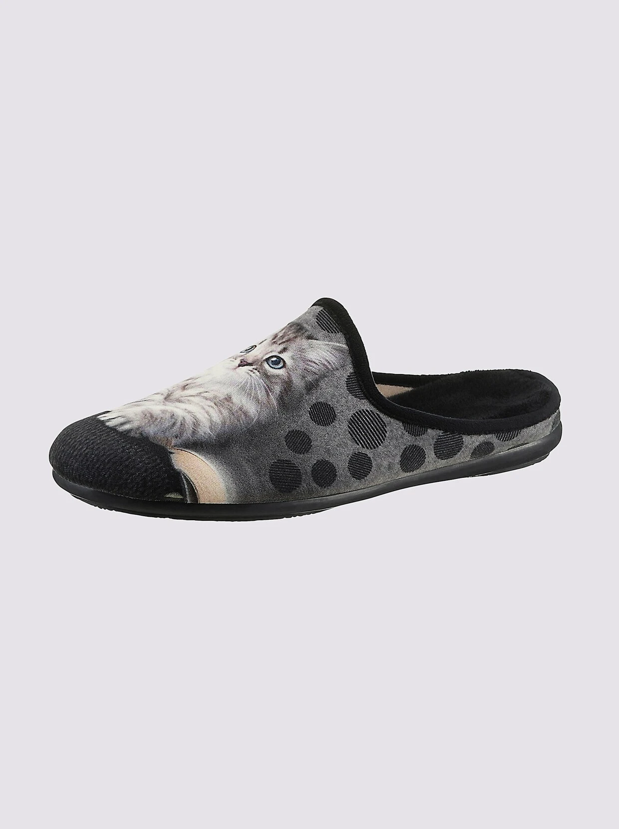 Schlüpfen Sie zuhause in pure Gemütlichkeit! Pantoffel von May Be mit tollem Katzen-Motiv. Außen und innen aus Textil. Weich gepolstert. Gummi-Laufsohle mit ca. 20 mm Absatz. Weite G.
