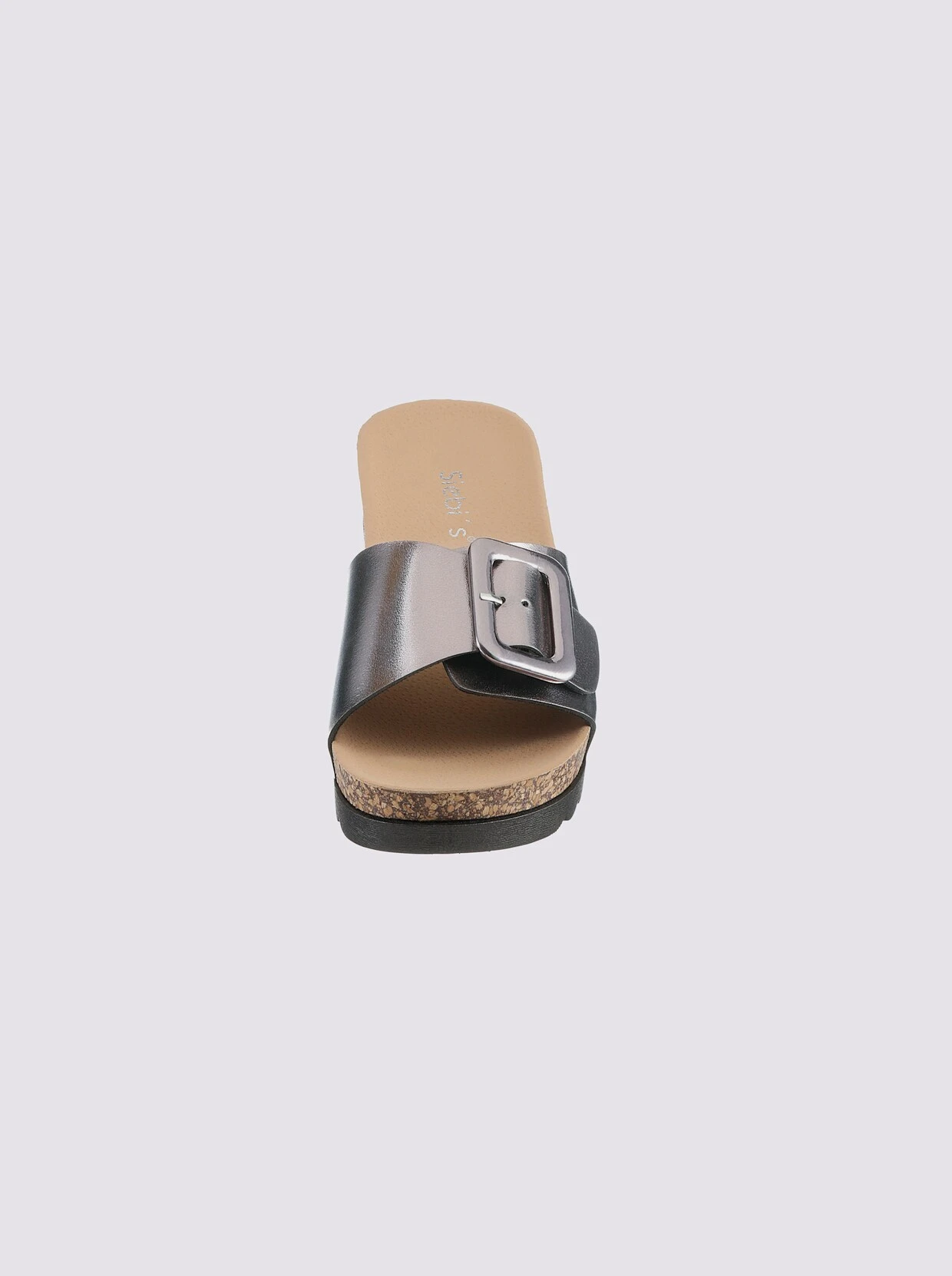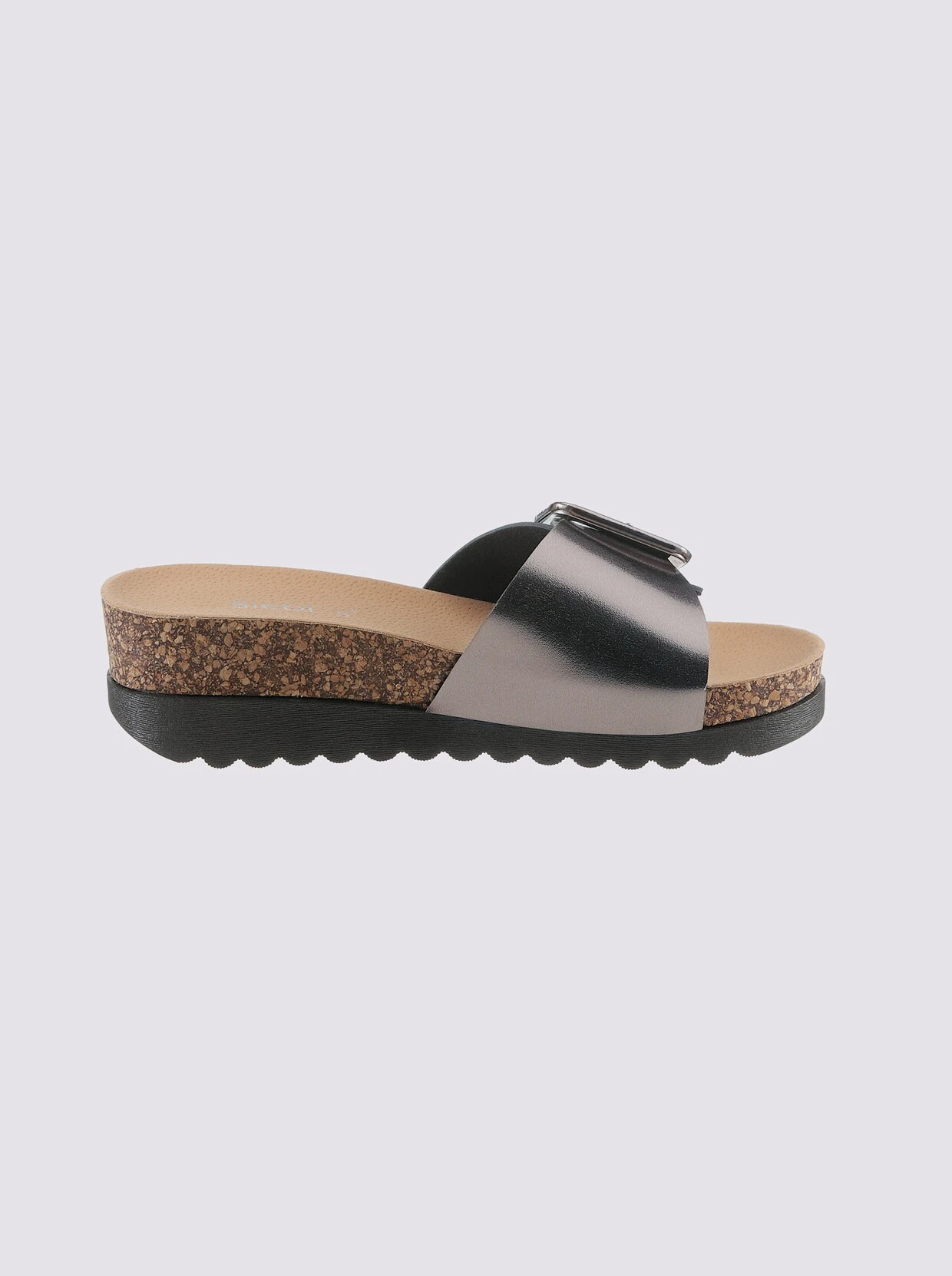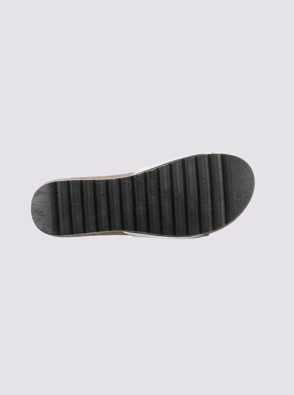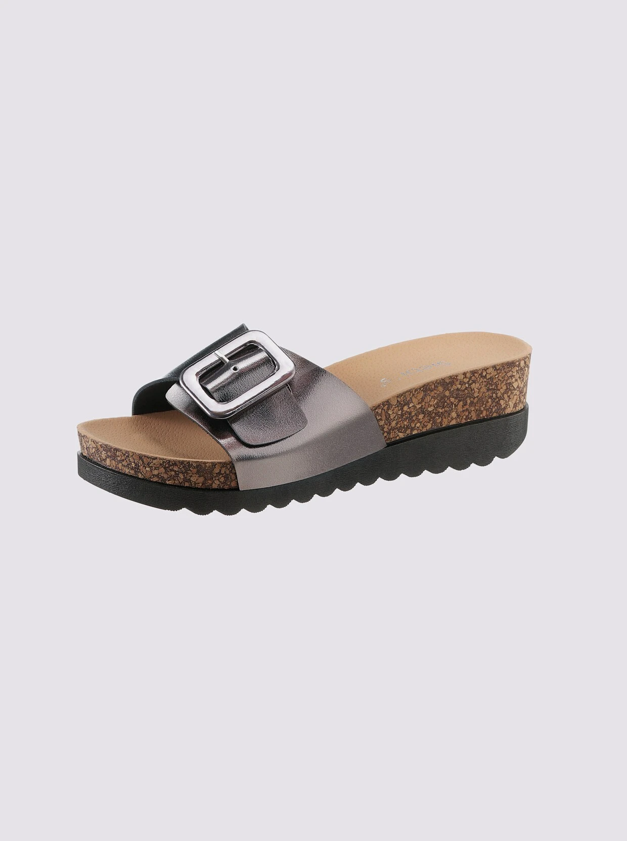Schicke Pantolette für Sie! Mit Keilabsatz (Absatzhöhe ca. 5 cm) in Kork-Optik und dekorativer Schließe – so kann er individuell in der Weite verstellt werden. Obermaterial Synthetik.