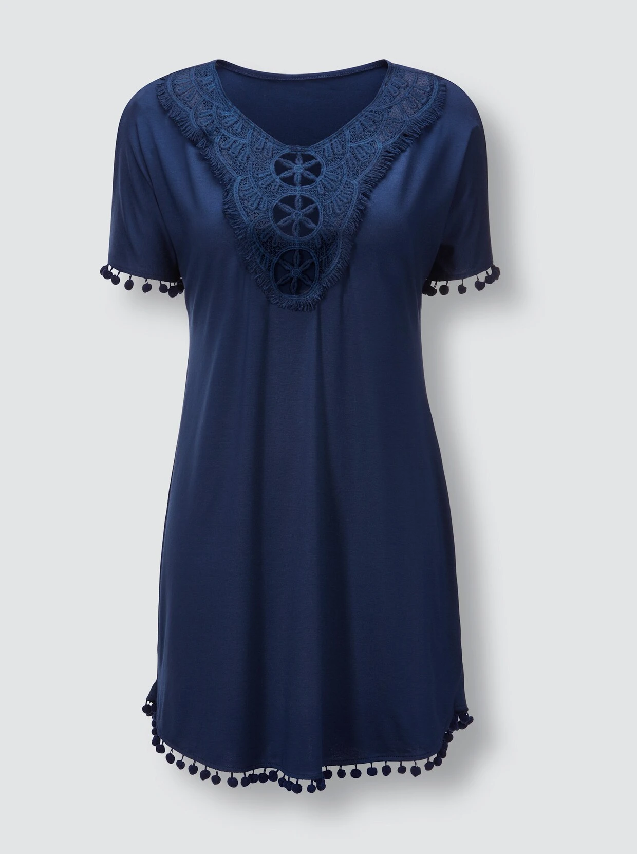 Verspielte Tunika aus luftigem Single-Jersey. Der V-Ausschnitt ist mit einer hübschen Spitze und die Abschlüsse mit witzigen Bommeln verziert. Schön schmeichelnd fällt sie durch den lässigen Schnitt.