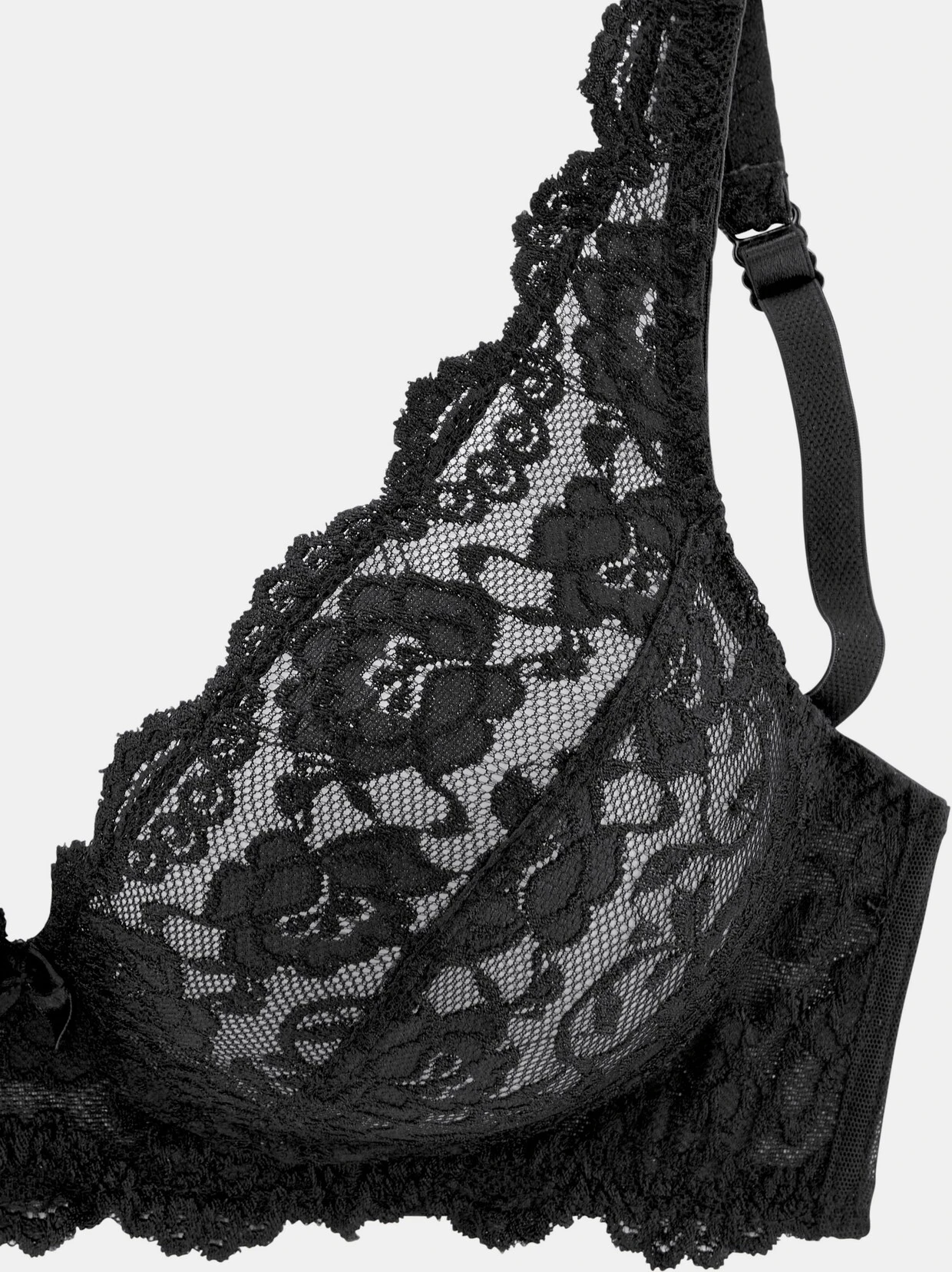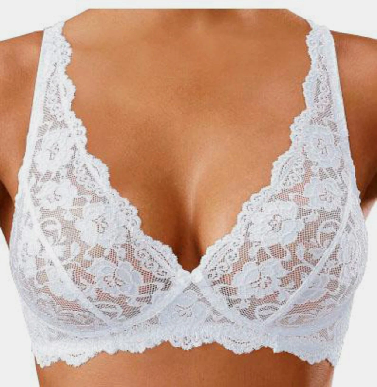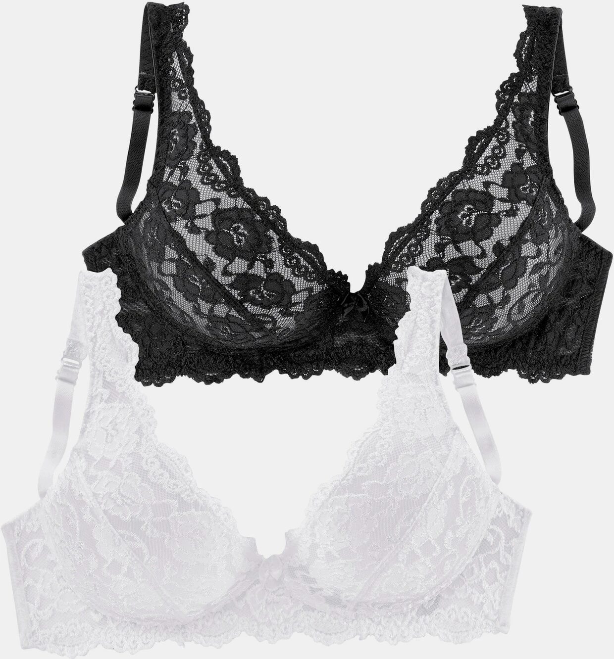 Softer Bralette- BH von Petite Fleur. Ungefütterte Cups aus leicht glänzender Vollspitze in leicht transparenter Optik. Der Rücken ist aus Netzmaterial gearbeitet. Träger und Rückenverschluss verstellbar. Im günstigen 2er-Pack. Sexy Dessous. Spitzen-Dessous. Romantische Dessous. Verspielte Dessous. Der BH ist aus 80% Polyamid, 20% Elasthan. BHs sind nicht trocknergeeignet, da die Versteller und Ringe durch die Hitze beschädigt werden und brechen.