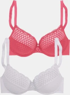 Dieser modische Bügel-BH von Petite Fleur kommt direkt in einem attraktiven Doppelpack! Das komplette Cup ist in einer grafischen Spitze in Löcher-Optik gehalten und in der vorderen Mitte rundet eine kleine Zierschleife das Design gekonnt ab. Im Untercup ist das modische Netzmaterial blickdicht unterlegt, während es oben die Haut verführerisch durchschimmern lässt. Doch auch in puncto Bequemlichkeit hat dieser BH einiges zu bieten: Die Cups sind aus elastischem Microtouch Material gefertigt und durch die Verstellmöglichkeit von Trägern und Rückenverschluss wird der Tragekomfort noch verstärkt. Dieser BH hat einfach alles! Sexy Dessous. Spitzen-Dessous. Romantische Dessous. Verspielte Dessous. Aus 88% Polyamid, 12% Elasthan