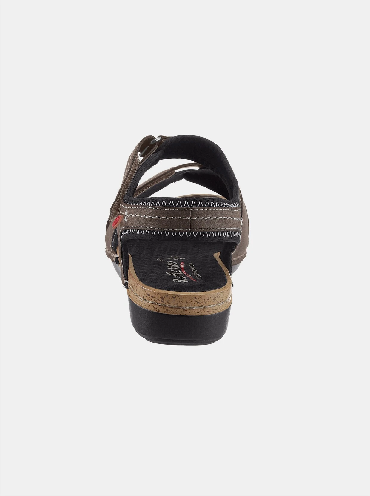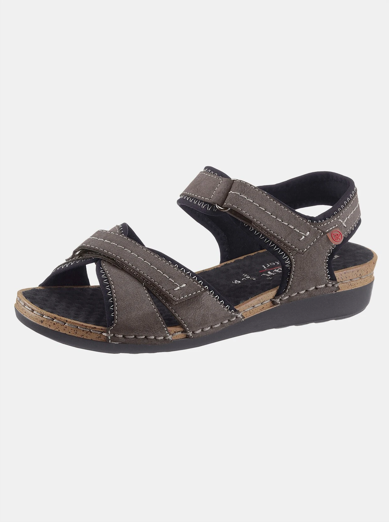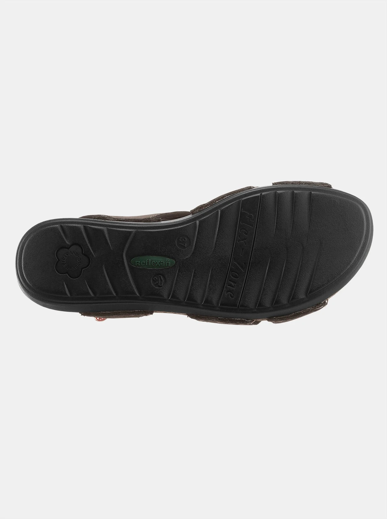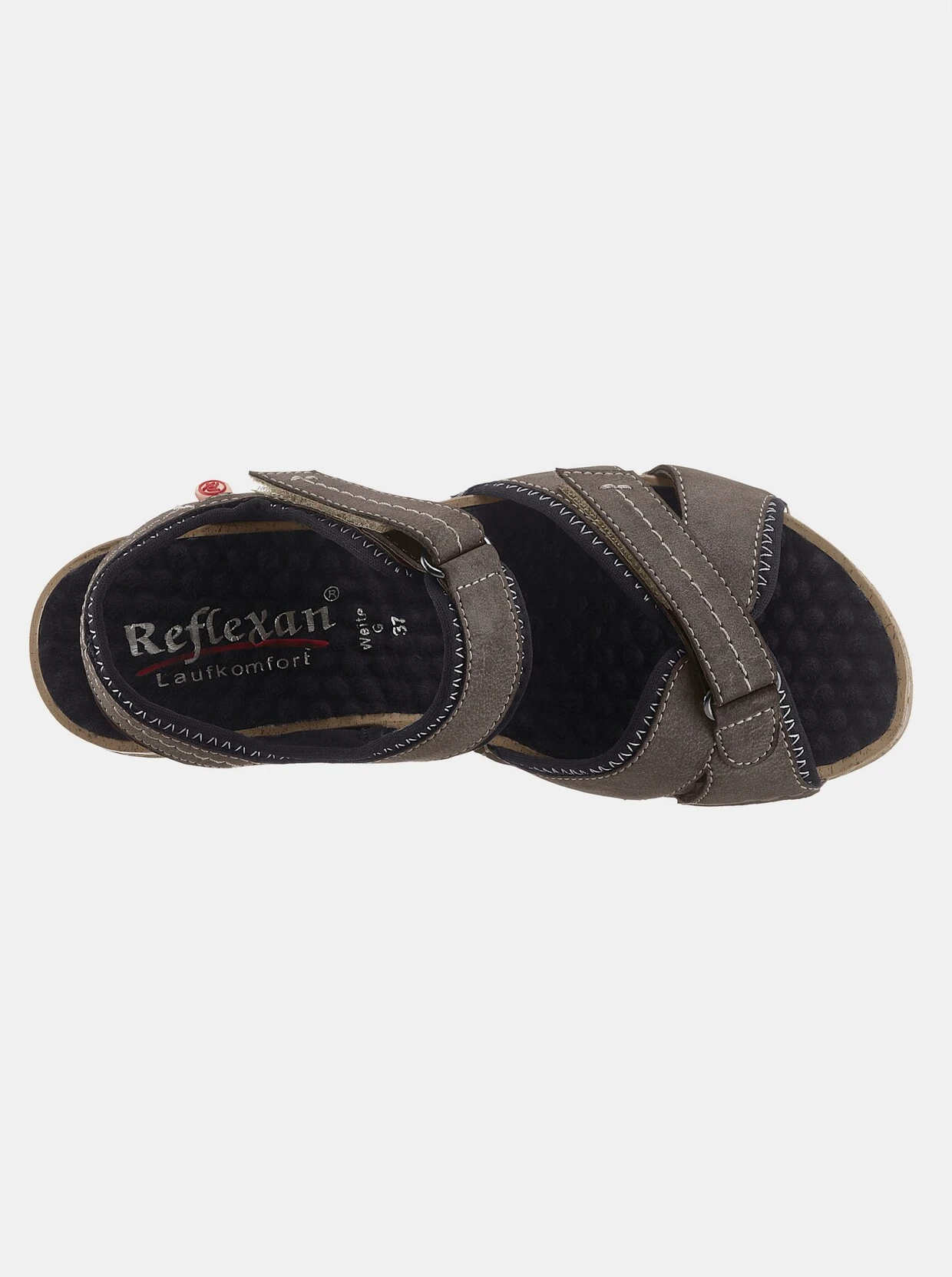 Sandale von Reflexan aus Lederimitat mit Kontrastnähten. Doppelter Klettverschluss am Rist. Gepolsterte Textil-Innenausstattung. Massagefußbett aus Lederimitat. Rutschhemmende TR-Laufsohle. Absatzhöhe ca. 35 mm. Weite G.