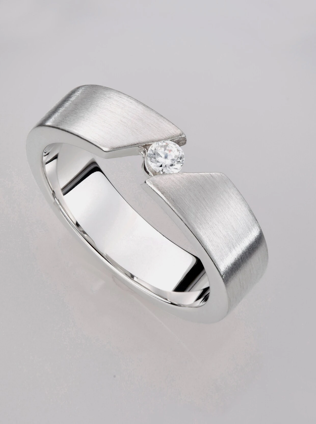 Eleganter Ring mit funkelndem Zirkonia. Aus 925er Silber, mattiert und rhodiniert.