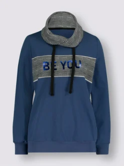 Innen verwöhnt die weich angeraute Baumwoll-Qualität, außen ziehen viele modische Details die Blicke auf sich: Sweatshirt mit angesagtem Hahnentrittmuster am überlappenden, halsfernen Rollkragen mit Tunnelzug und Bindeband. Hahnentritt-Einsatz im Vorderteil mit Kontrastpaspeln und Glanz-Schriftzug. Gerippte Bündchen an den langen Ärmeln und am Saum.