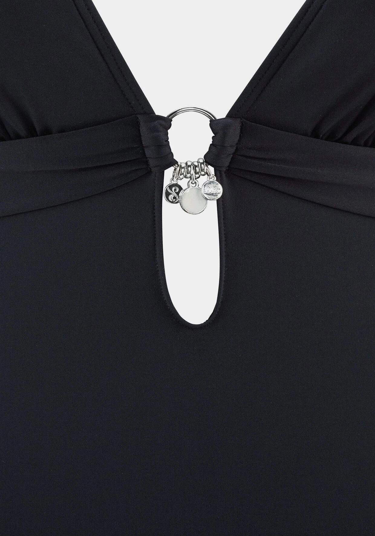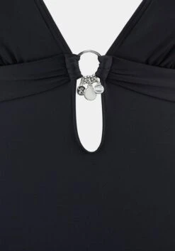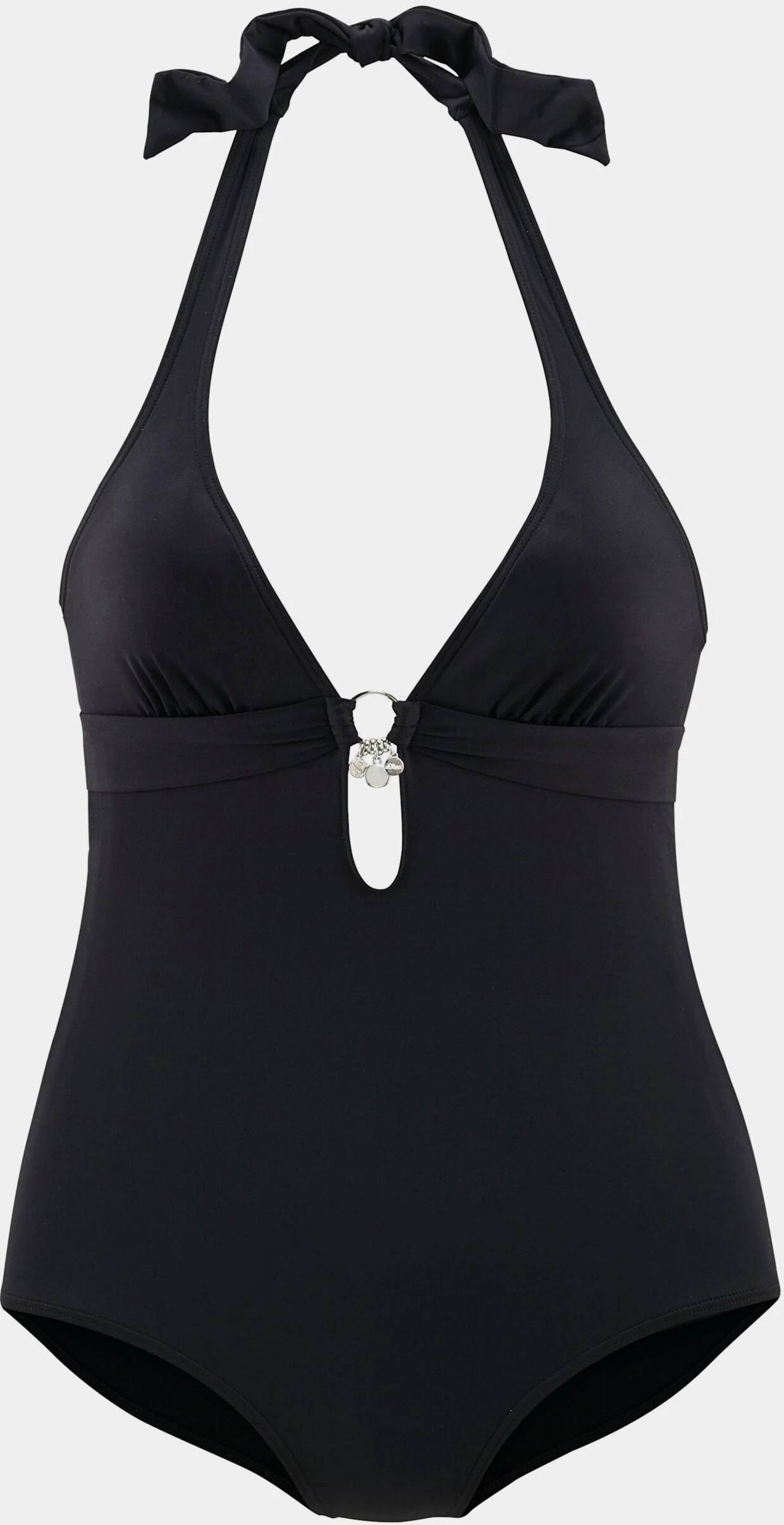 Bademoden von s.Oliver RED LABEL Beachwear mit silberfarbenen Accessoires als besonderes Trend-Detail. Badeanzug mit Accessoires zwischen den Cups, darunter mit raffinierter Öffnung. Herausnehmbare Cups, im Nacken zu binden und im Rücken zu schließen. Vorn gefüttert. Softe Microfaser.