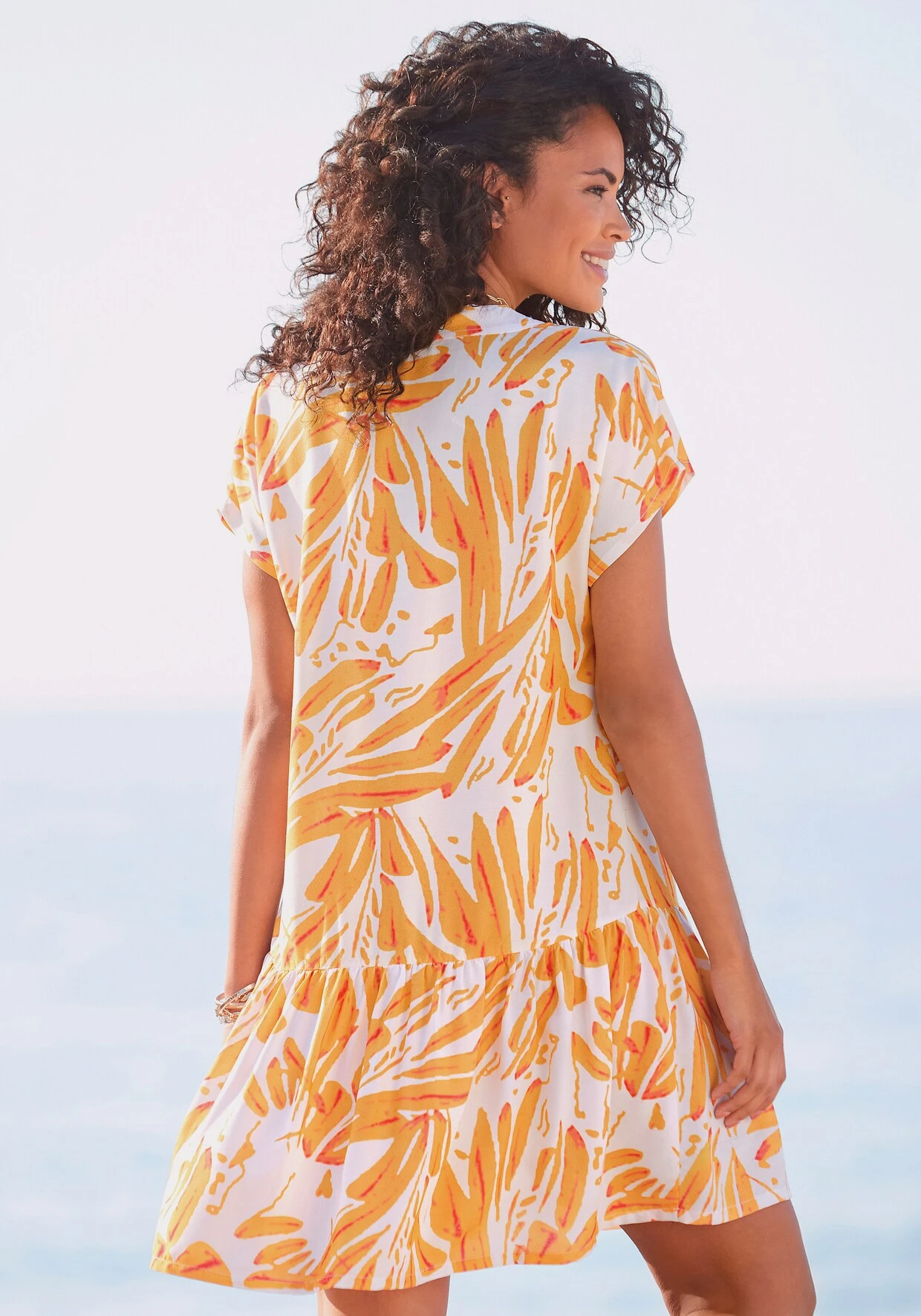 Tunikakleid von s.Oliver. Mit Alloverprint. Tunikaausschnitt mit breiter Blende. Kurze Ärmel. Rock mit breitem Volantbesatz am Saum. Lockere Passform. Weiche Qualität.