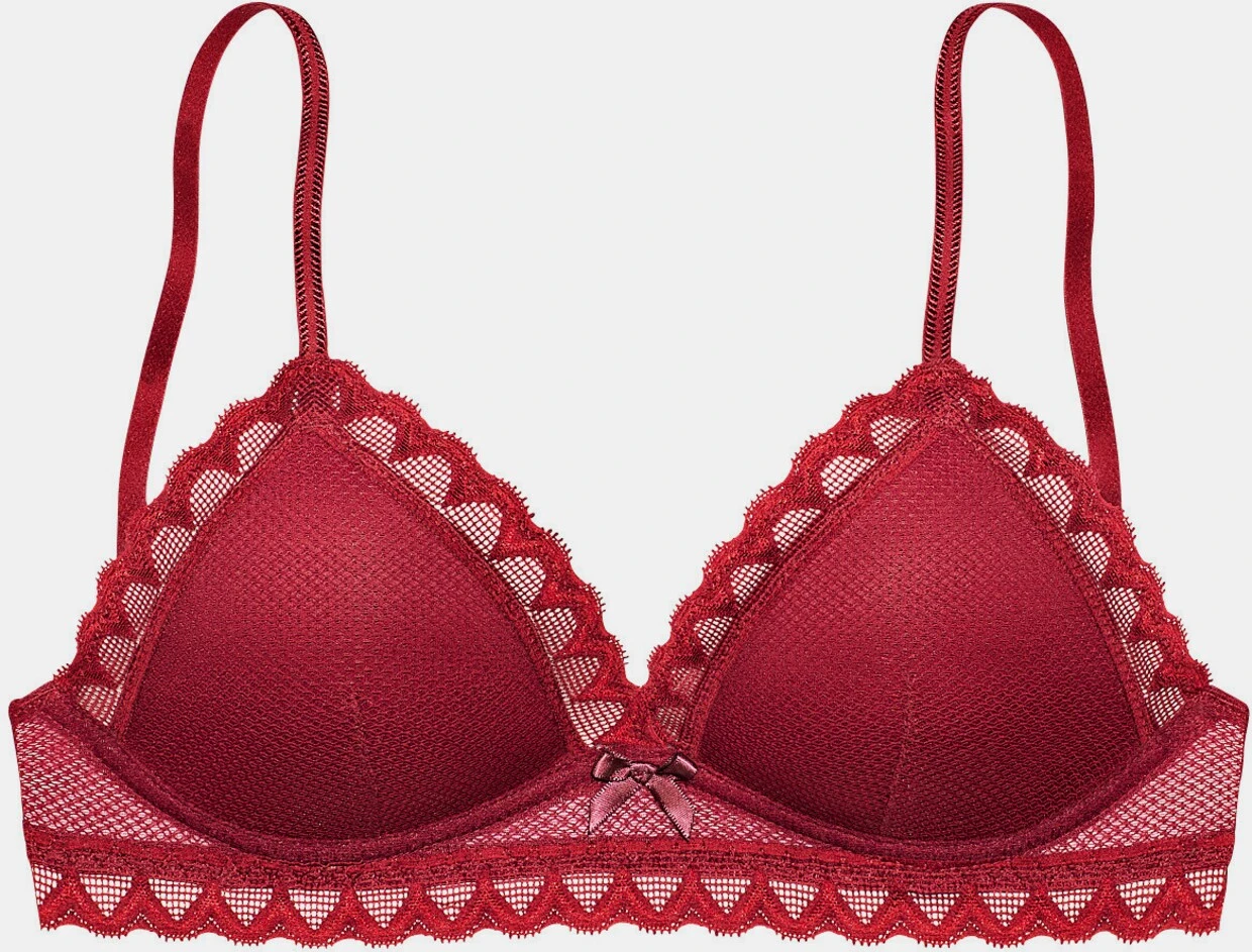 Modischer Bralette-BH mit graphischer Spitze. Cups mit eingearbeiteter Schale ohne Bügel. Kleine Zierschleife in der vorderen Mitte. Mit passenden Unterteilen aus der gleichen Serie. Träger und Rückenverschluss sind verstellbar. Klassische Dessous. Bequeme Alltags-Dessous. Modische Dessous. Aus 60% Polyamid, 35% Polyester, 5% Elasthan