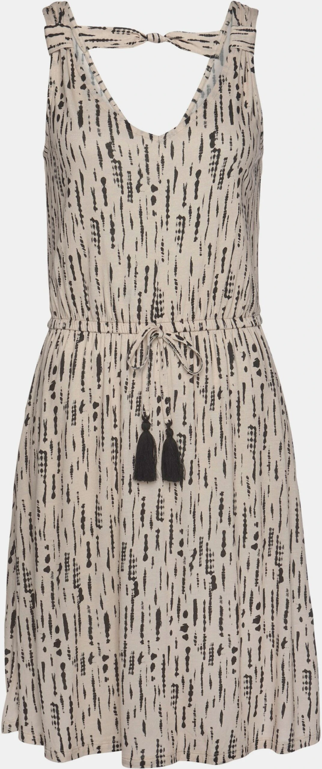 Verspieltes Kleid von s.Oliver mit Alloverdruck. Tiefer V-Ausschnitt. Breite Träger im Rücken mit Einsatz verbunden. Taillierung durch Gummizug. Detail mit Kordel und Quasten. Rockteil leicht ausgestellt. Schön für Sommer und Urlaub. Softes Material.