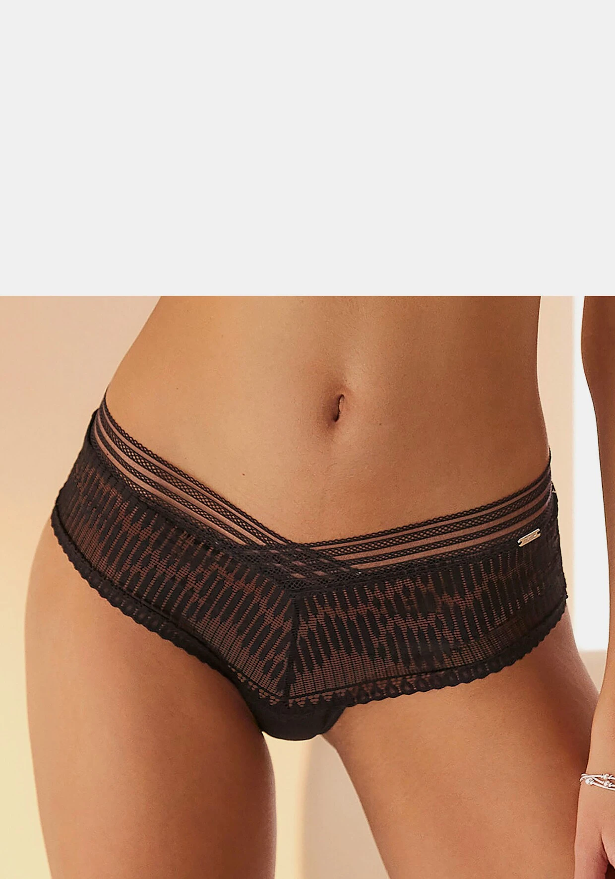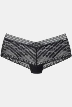 Modische Stringpanty in abdeckender Schnittform. Bund in dezenter Bänder-Optik. Rundherum aus dezent transparenter Spitze in graphischer Optik. Mit eingearbeitetem Baumwollzwickel. Mit passenden BH’s aus der gleichen Serie erhältlich. Obermaterial: 88% Polyamid, 12% Elasthan.