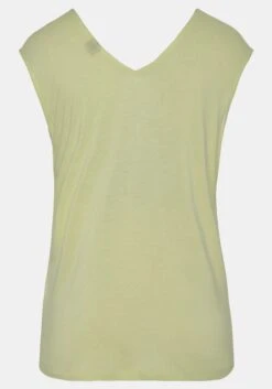 Vorn und hinten mit tiefem V-Ausschnitt, der mit Bändern modisch verziert ist. In creme leicht transparent. Länge ca. 64 cm. Aus 100% Viskose.