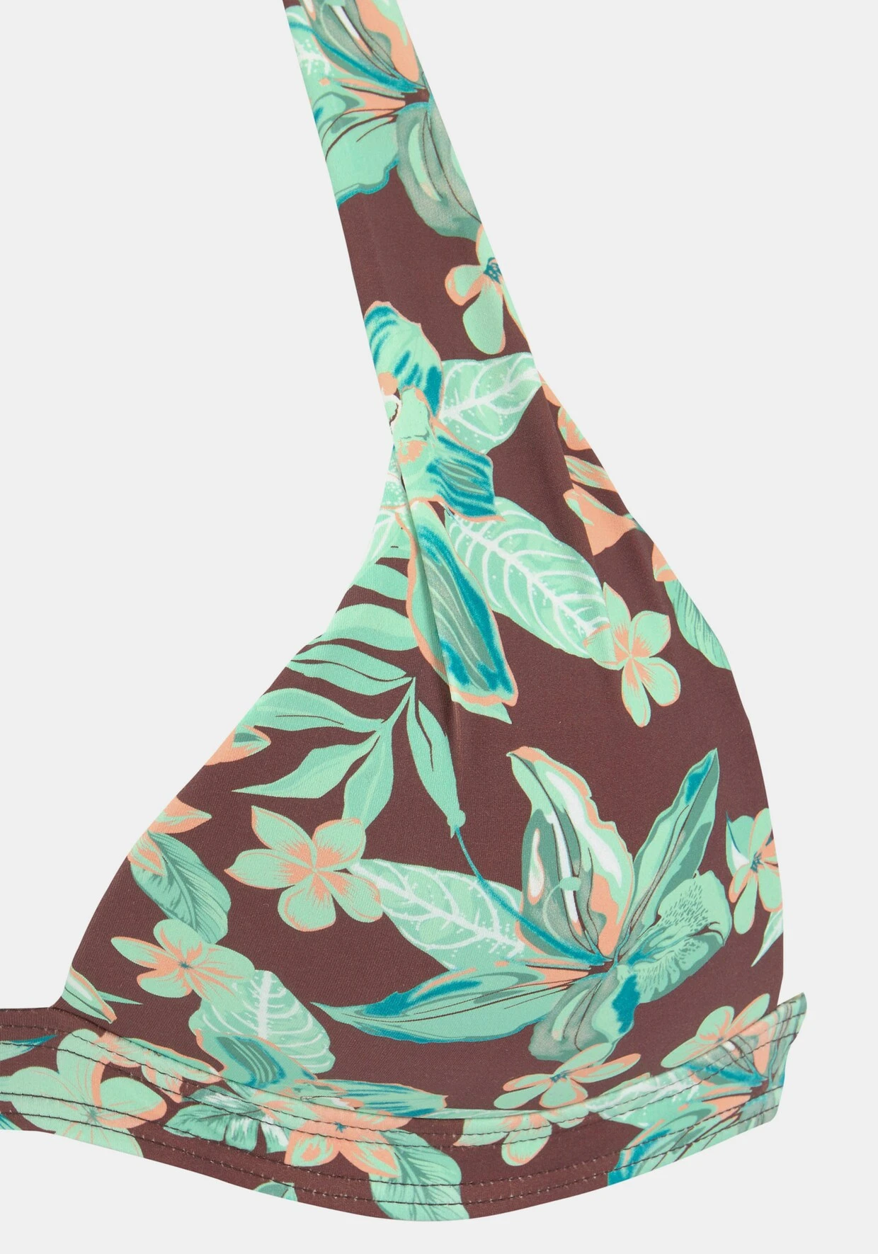 Süßer Triangel-Bikini von s.Oliver in floralem Allovermuster. Wattierte Cups und Neckholder zum Binden. Hose mit dekorativen seitlichen Schlaufen. Recycelte Microfaser mit weichem Griff.