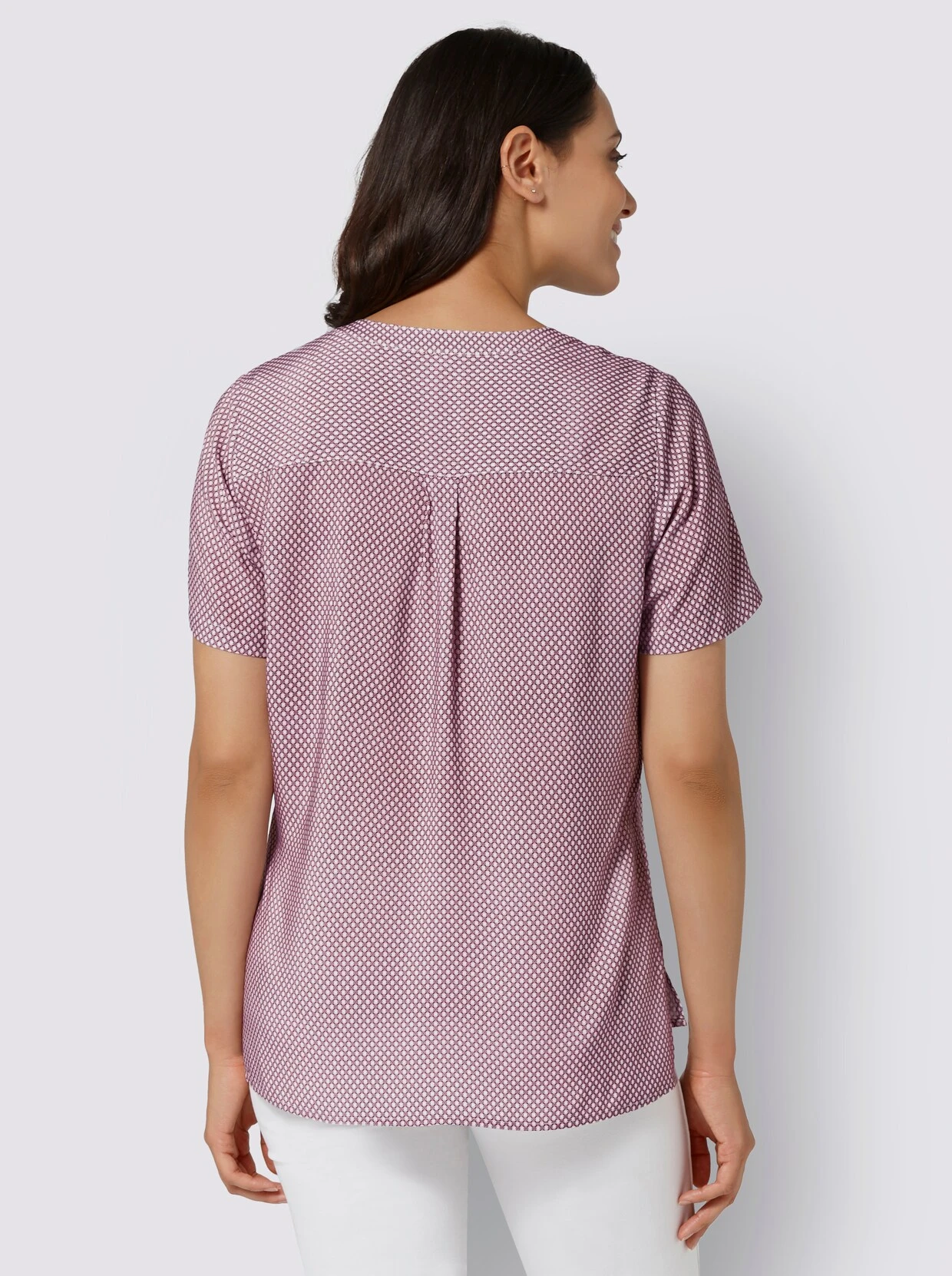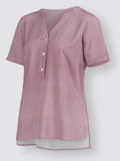 Die Bluse im Minimaldessin gefällt durch die lässige, figurschmeichelnde Schlupfform mit kombiniertem Rundhals-V-Ausschnitt und anschließender kurzer Knopfleiste. Hinten modisch länger gearbeitet sowie mit Schulterpasse und Kellerfalte für viel Bewegungsfreiheit. Formgebende Brustabnäher. Seitenschlitze.