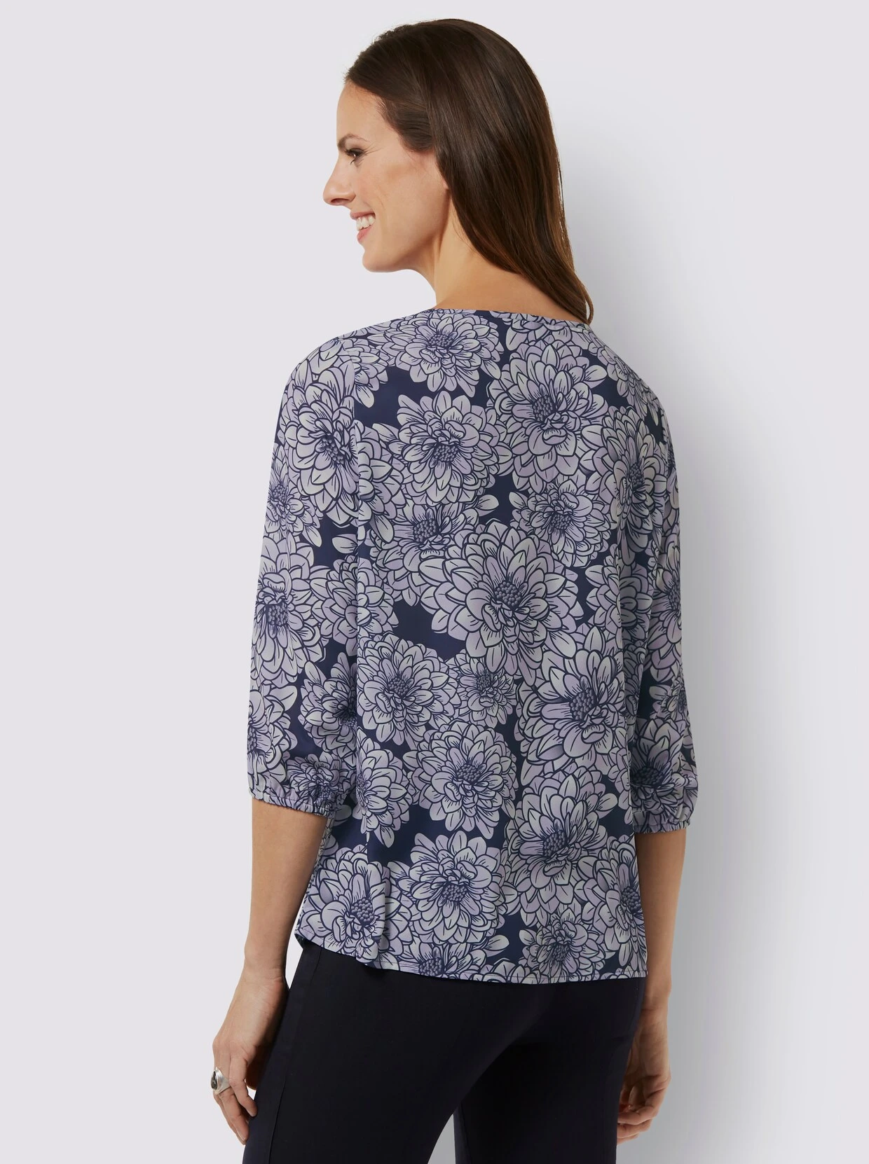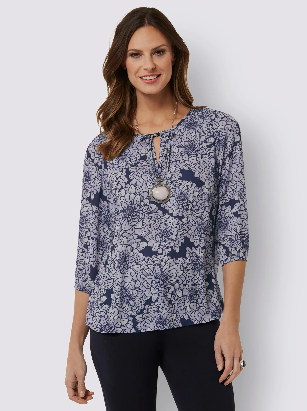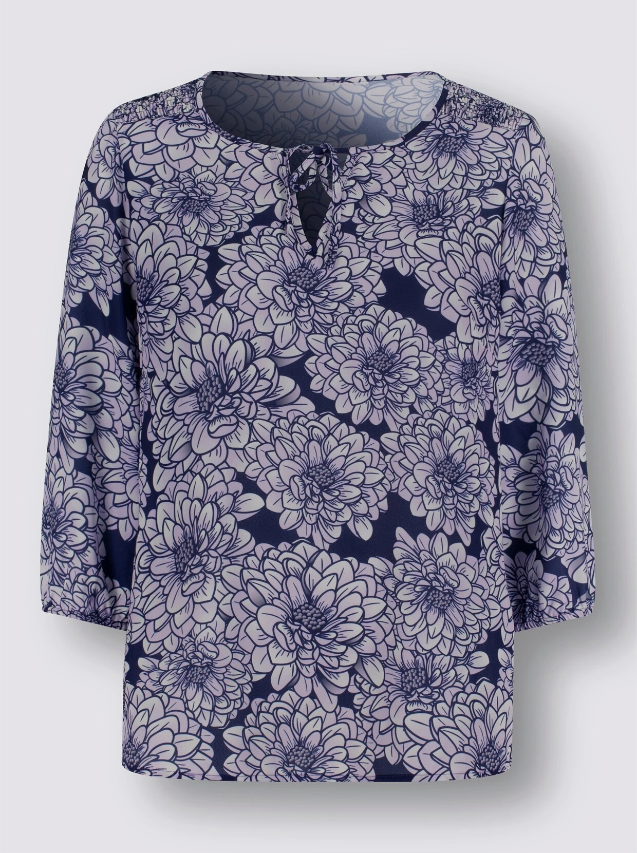 Sehr edel gibt sich diese Bluse im ausdrucksstarken Blütendessin. Rundhals-Ausschnitt mit reizvoller V-förmiger Aussparung und Bindebändchen. Brustabnäher, kleine Falten am Ansatz der 3/4-langen Ärmel, Gummizug am Abschluss. Aus recyceltem Polyester.