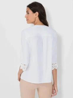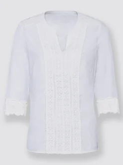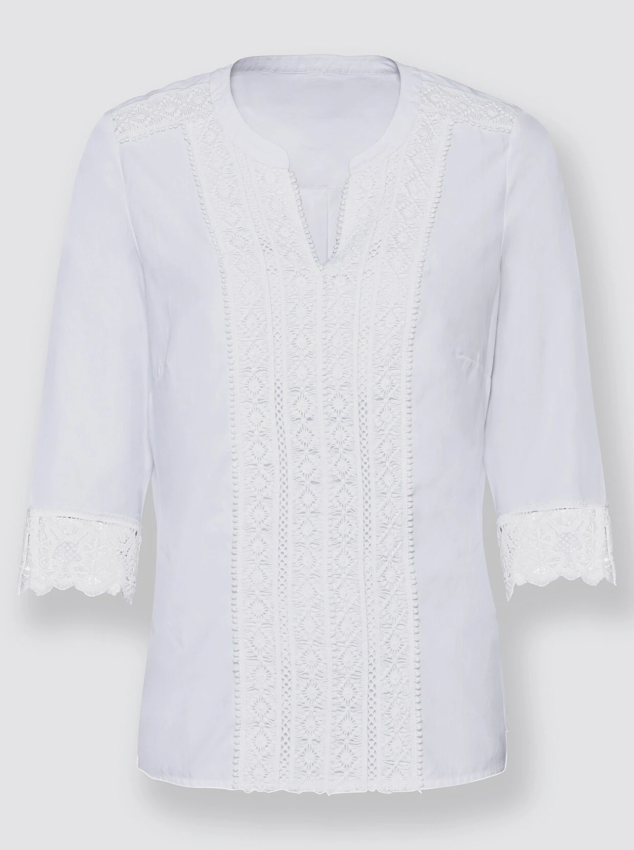 Seine charmante Ausstrahlung bekommt diese Bluse durch die Spitze, die von der Schulter bis zum Saum verläuft. Sie ist im Vorderteil blickdicht unterlegt, während die Schulterpartie leicht transparent bleibt. Rundhals-Ausschnitt mit offenem V. Formgebende Brustabnäher. Die Kellerfalte unterhalb der rückwärtigen Schulterpasse verleiht angenehme Weite. Aktuelle 3/4-Ärmel mit transparentem Spitzenbesatz und gebogtem Abschluss.