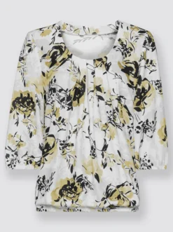 Ein wunderschöner Figurschmeichler! Die bedruckte Bluse fällt durch die Gummibündchen an den 3/4-Ärmeln und am Saum besonders vorteilhaft und kaschiert so gekonnt. Der Rundhals-Ausschnitt vorne ist in kleine dekorative Falten gelegt.