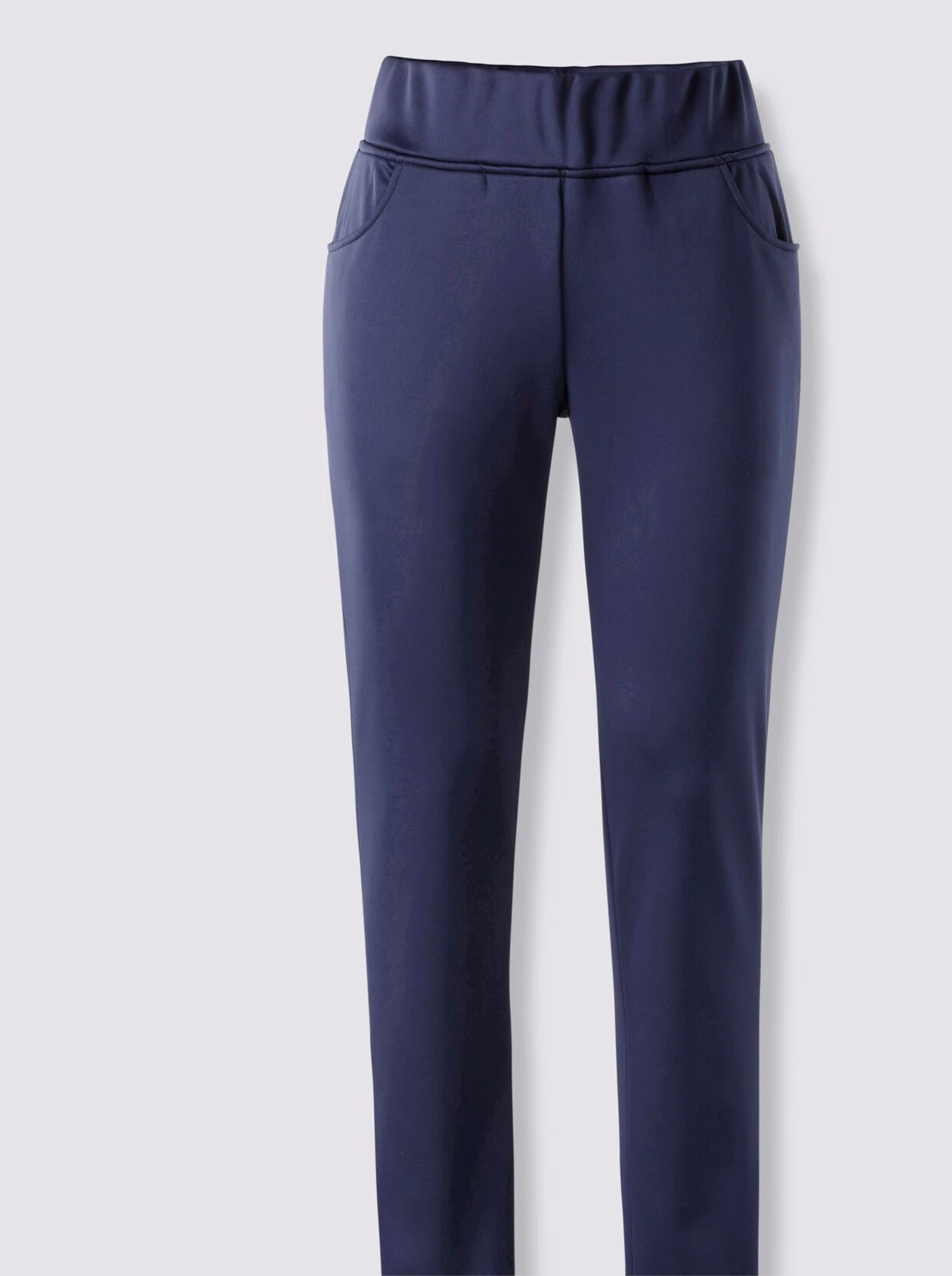 Diese Hose hält ein Geheimnis für Sie bereit: Außen überzeugt sie mit ihrem sehr gepflegten, dezent glänzenden Erscheinungsbild, innen bietet sie eine unglaublich samtige Qualität. Die gesamte Innenseite ist mit softem Fleece überzogen, der Sie mit weichem Tragegefühl verwöhnt und Sie angenehm wärmt. Von außen ist dieser Trick nicht zu sehen! Mit breitem Rundum-Dehnbund, der sich schön anschmiegt und nicht aufträgt. Jeweils 2 Taschen vorne und hinten. Fußweite ca. 36 cm.