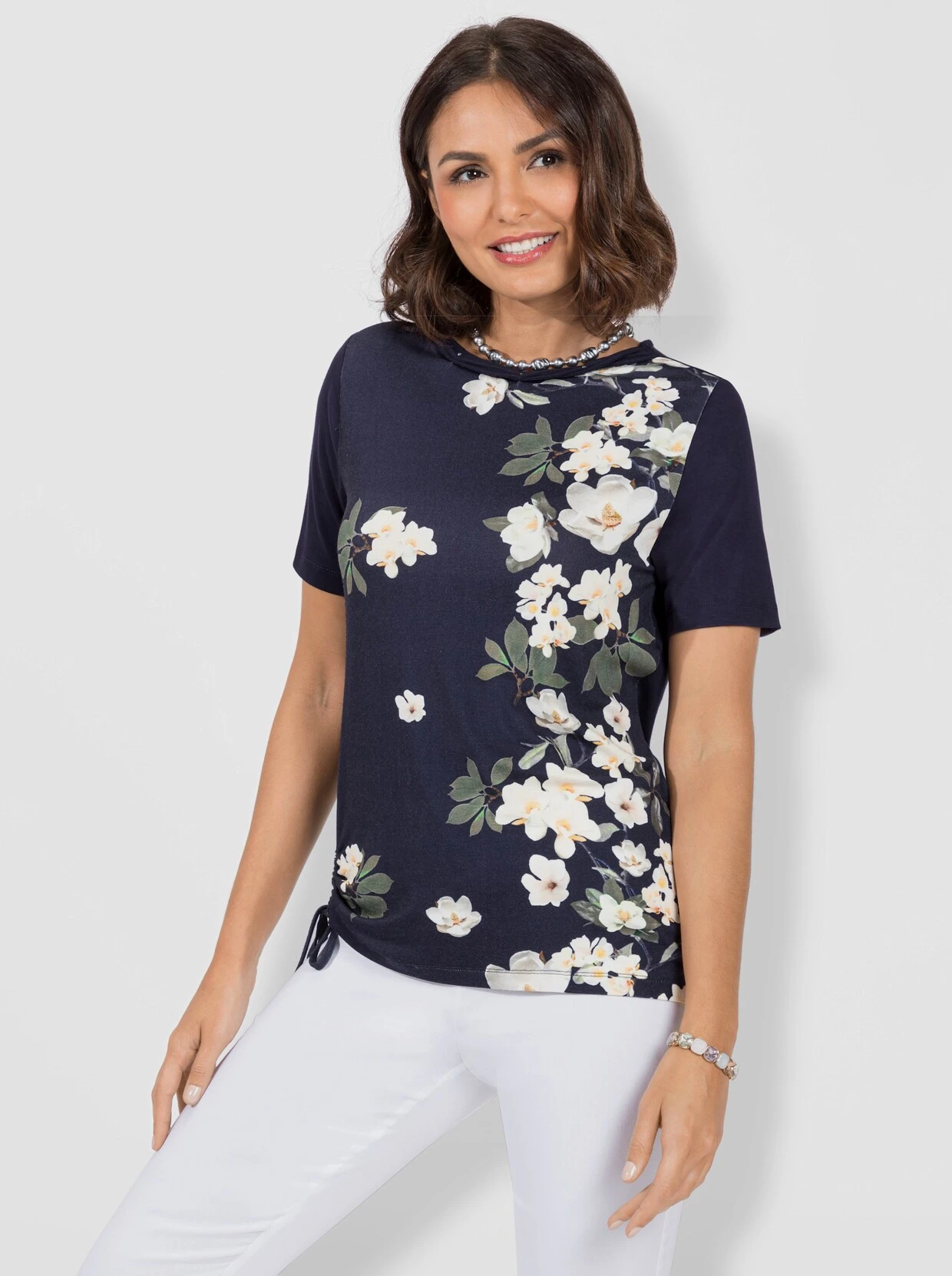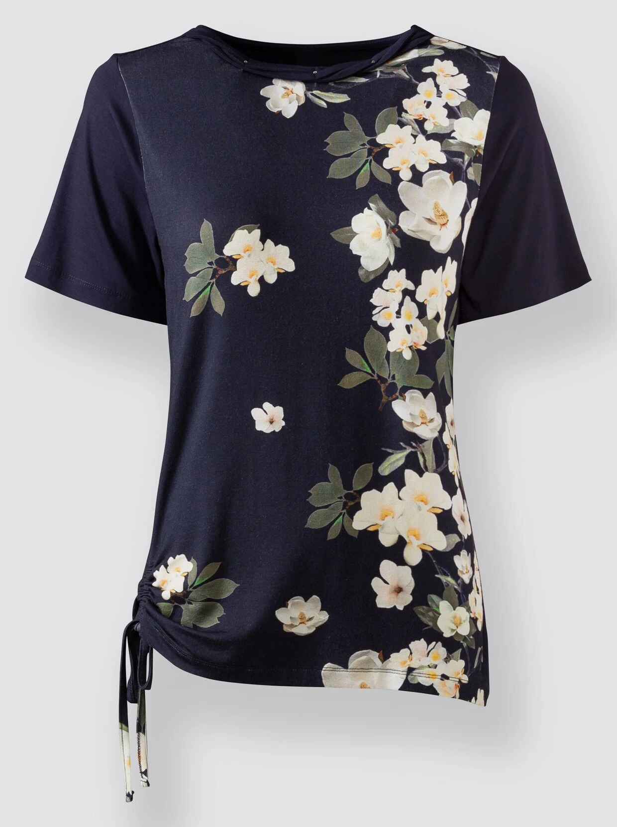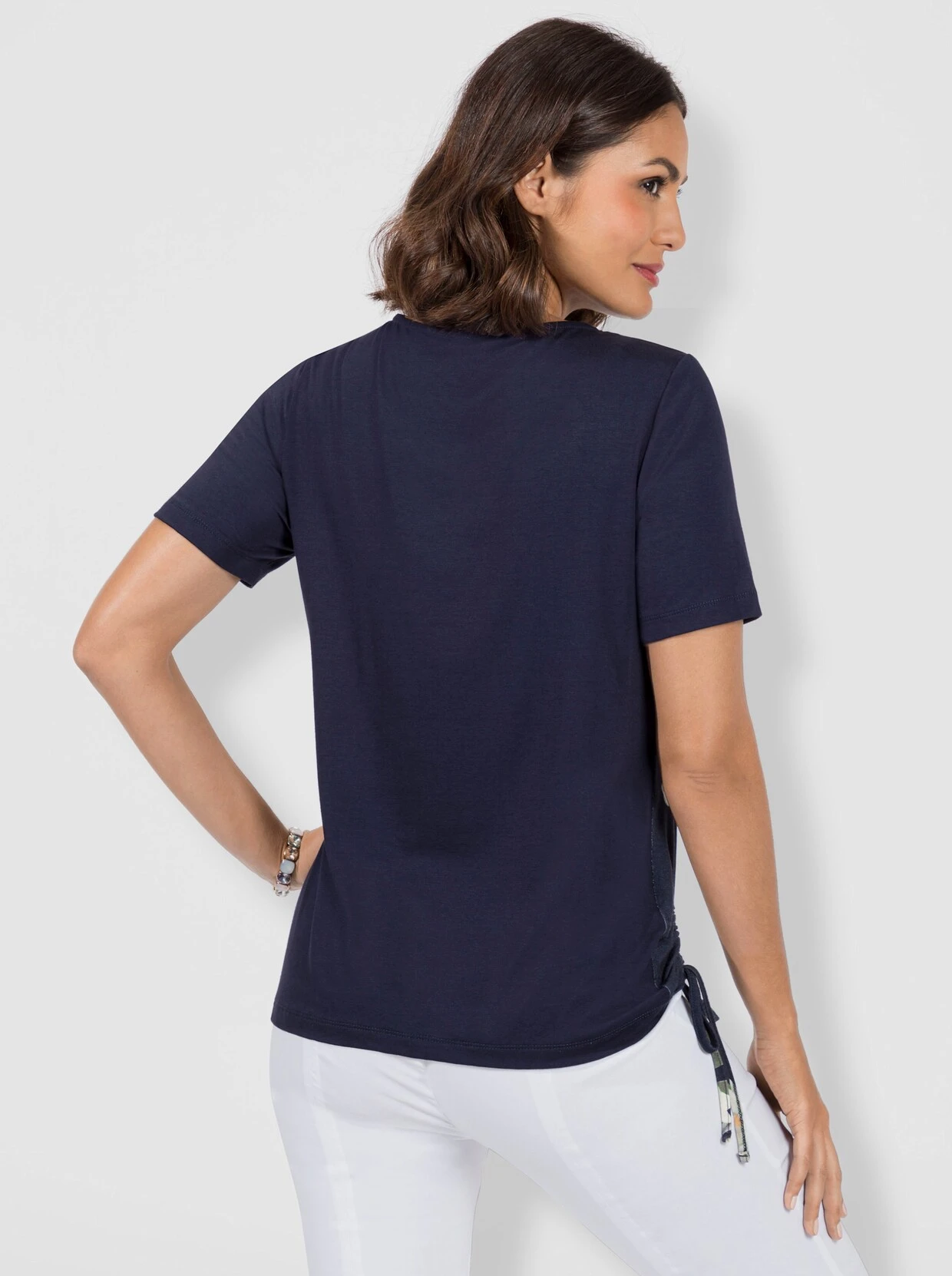 In dieses Shirt haben wir uns sofort verliebt! Der aufwändig gestaltete Rundhals-Ausschnitt ist mit Glitzersteinchen verziert. Seitlich kann dieses Modell mit einem Bindebändchen dezent gerafft werden. Rückteil in Uni.