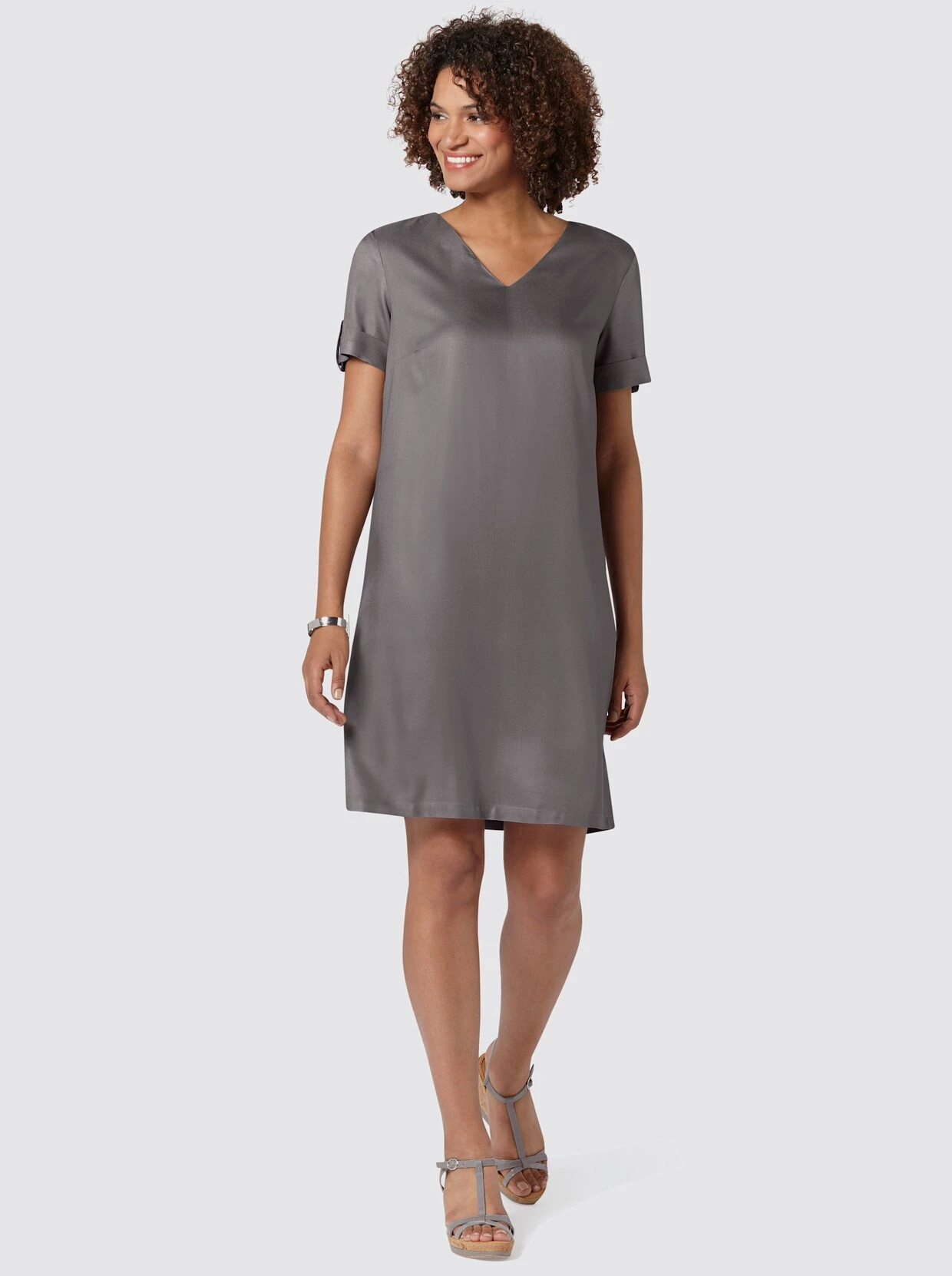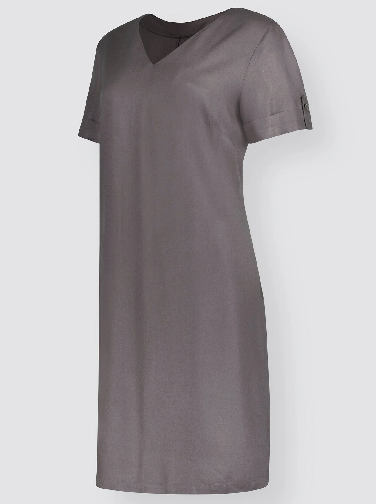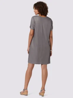 Reinschlüpfen. Wohlfühlen. Gut aussehen! Dieses Kleid erfüllt alle Voraussetzungen für Ihren neuen Sommer-Liebling! Tolle Qualität aus hochwertiger Twill-Viskose: wunderbar trageangenehm und weich fließend! V-Ausschnitt, Brustabnäher, kurze Ärmel mit Umschlag und Zierriegel.