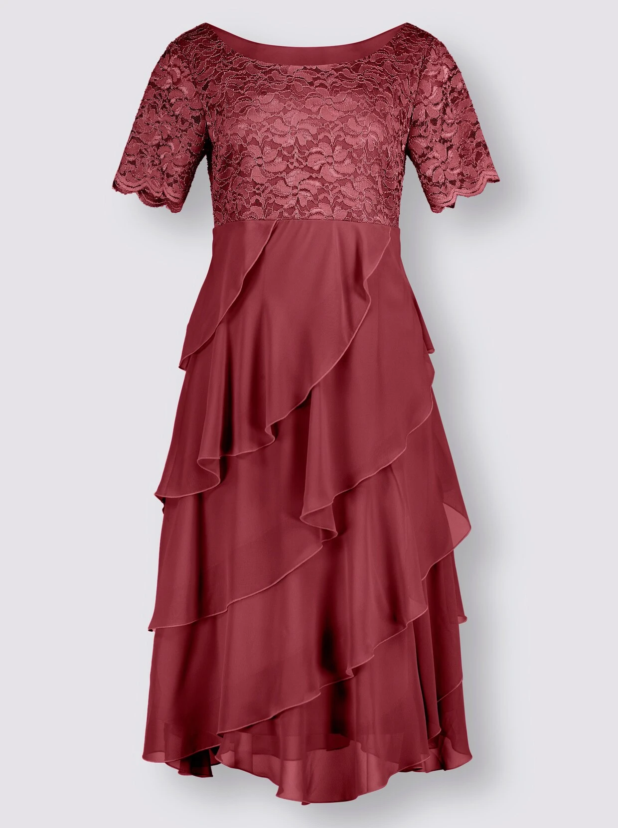 Werden Sie zum Eyecatcher: mit diesem figurschmeichelnden Kleid! Das Oberteil und die kurzen Ärmel mit gebogten Abschlüssen sind aus einer filigranen Spitze, die an den Armen leicht transparent bleibt. Der Lagen-Look entsteht durch die schräg aufgesetzten Volants aus feiner Chiffon-Qualität im unteren Teil. Dank Jersey-Futter blickdicht. Mit breitem Rundhals-Ausschnitt und seitlichem Reißverschluss.