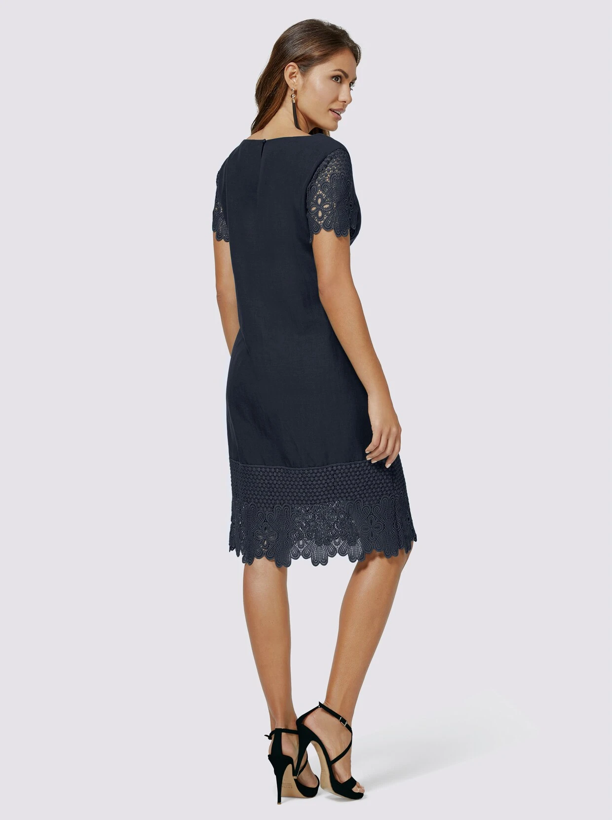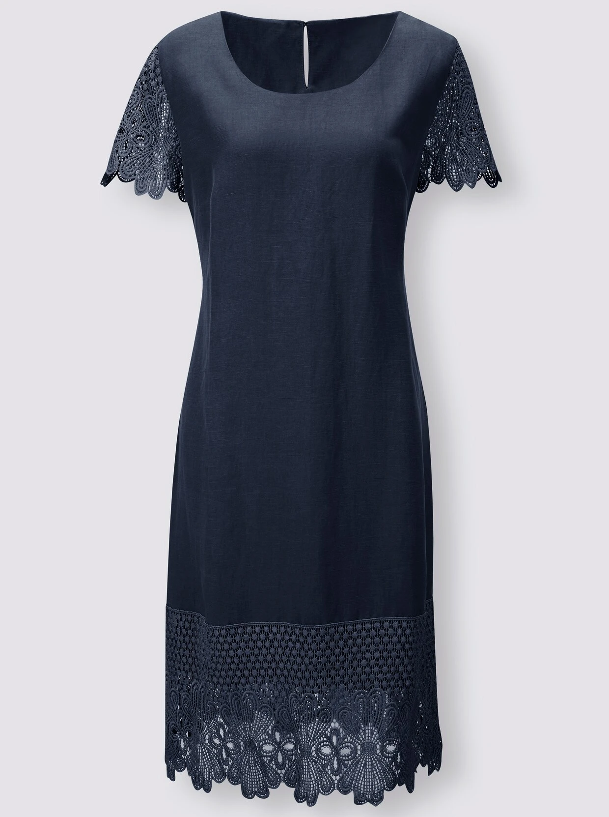 Das Kleid in hochwertig gewebter Lyocell-Leinen-Qualität fühlt sich ausgesprochen weich an und trägt sich luftig leicht. Ihre dezente Leinen-Struktur schimmert matt im Licht und ist an den Ärmeln und am Saum mit opulenter Spitze veredelt. Sehr langlebig und zuverlässig formstabil. Im Nacken mit Schlitz und Knopfverschluss. Figurfreundliche A-Linie.