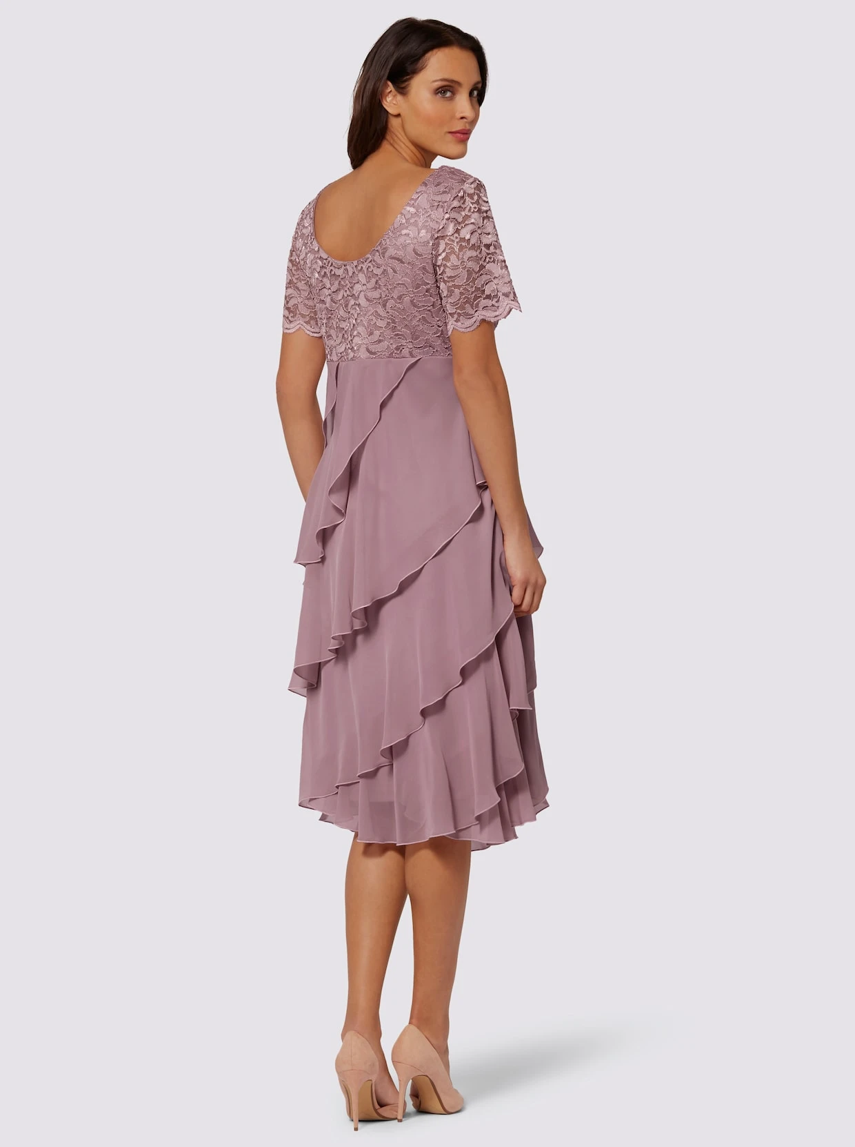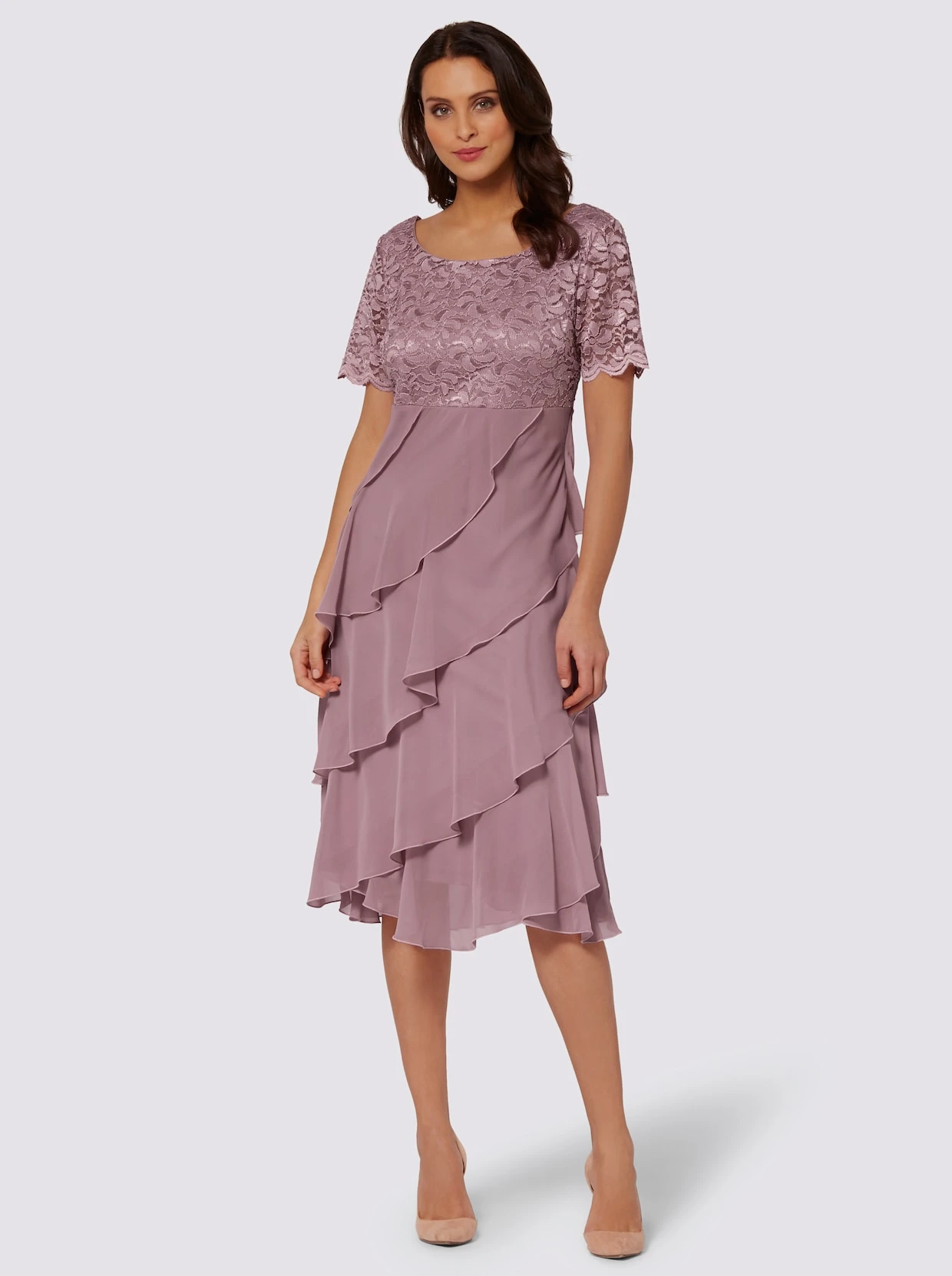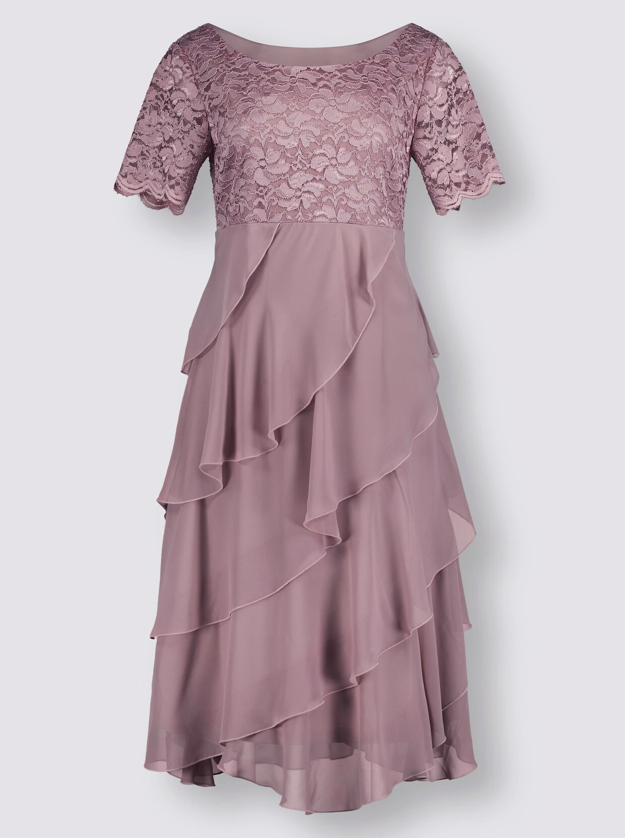 Werden Sie zum Eyecatcher: mit diesem figurschmeichelnden Kleid! Das Oberteil und die kurzen Ärmel mit gebogten Abschlüssen sind aus einer filigranen Spitze, die an den Armen leicht transparent bleibt. Der Lagen-Look entsteht durch die schräg aufgesetzten Volants aus feiner Chiffon-Qualität im unteren Teil. Dank Jersey-Futter blickdicht. Mit breitem Rundhals-Ausschnitt und seitlichem Reißverschluss.